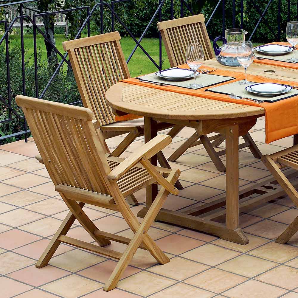 Table de jardin extensible en teck avec chaises et fauteuils.