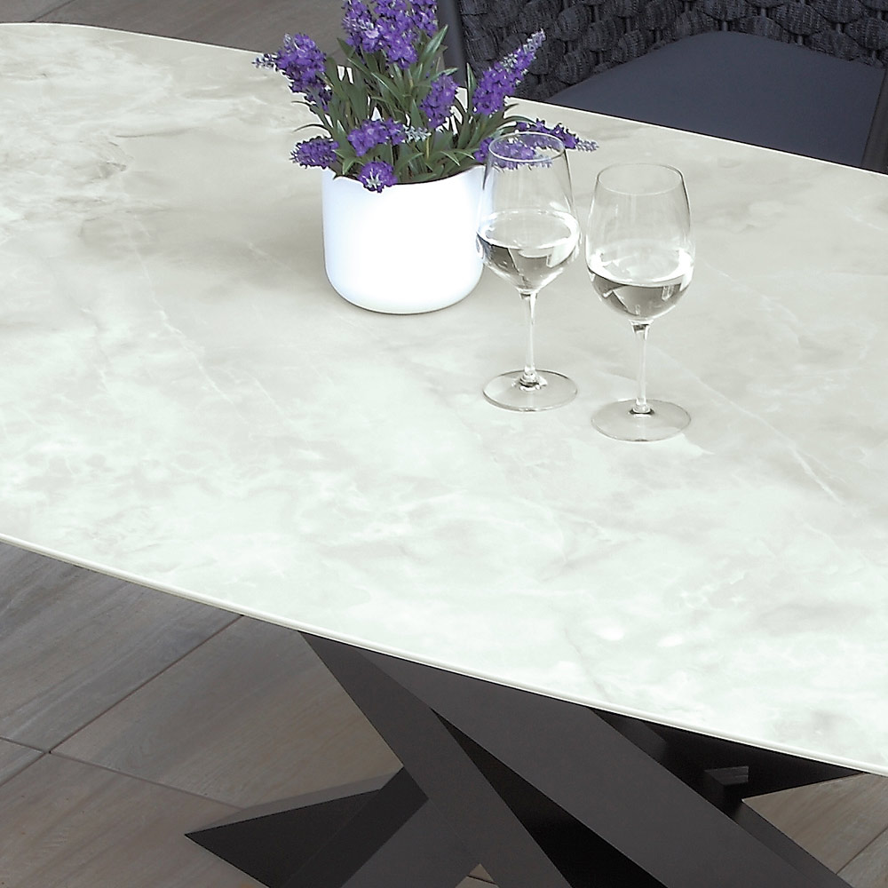Le plateau apporte une touche de luminosité sophistiquée et se distingue par sa texture délicate et ses bords arrondis, qui adoucissent la géométrie de la table, la rendant parfaite aussi bien pour les espaces privés que professionnels. Le piétement en croix, sculptural et visuellement saisissant, offre une excellente stabilité et une touche de personnalité contemporaine .