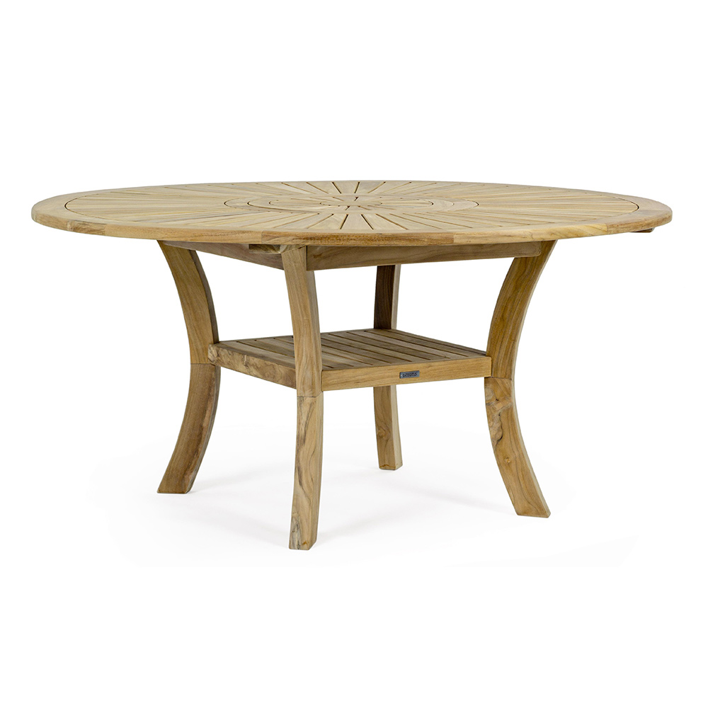 Table à manger extérieure de qualité en bois de teck avec plateau pivotant central.