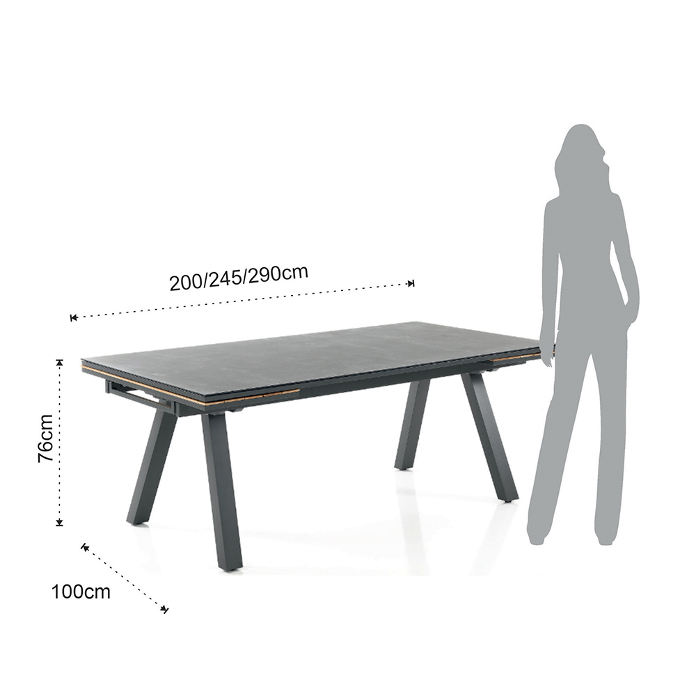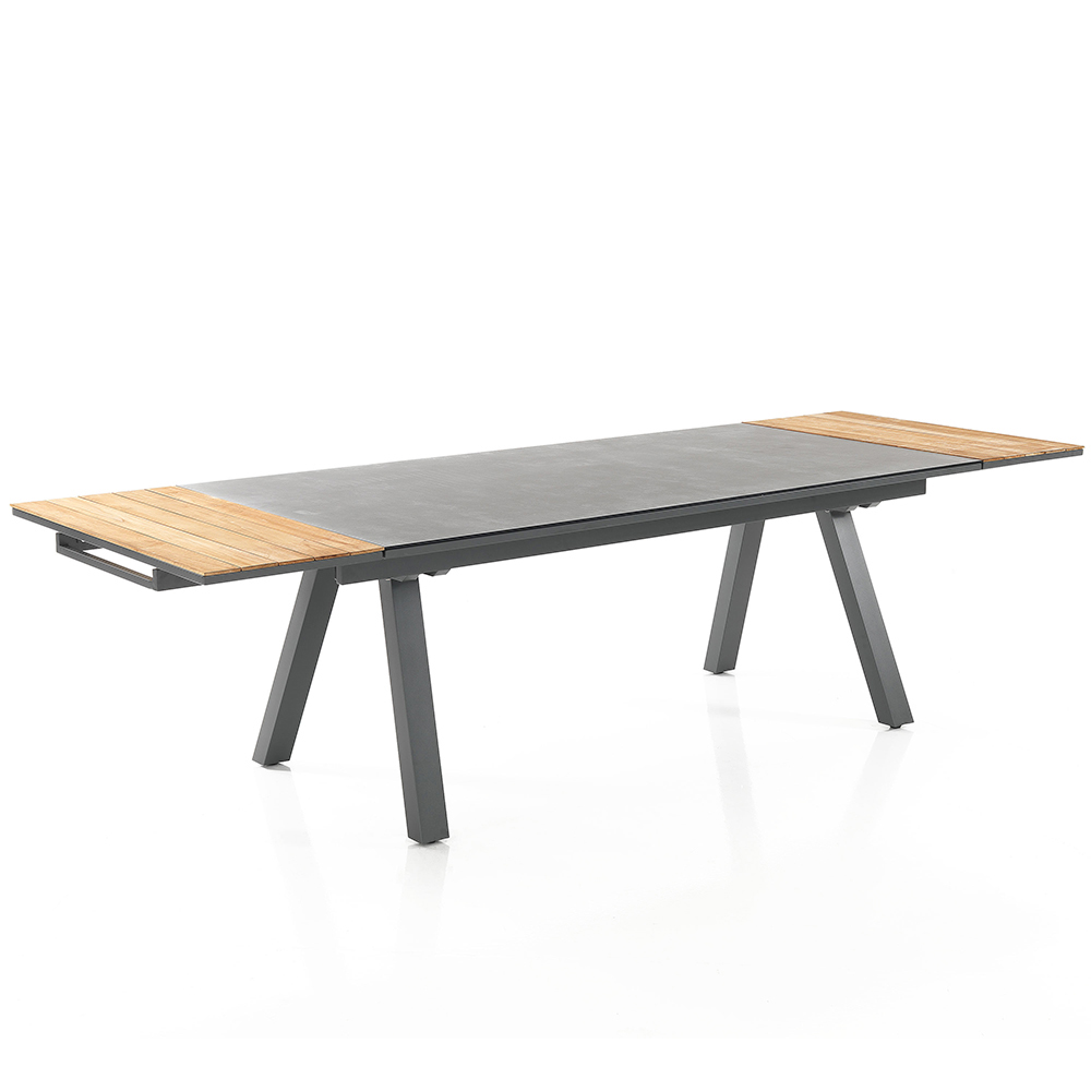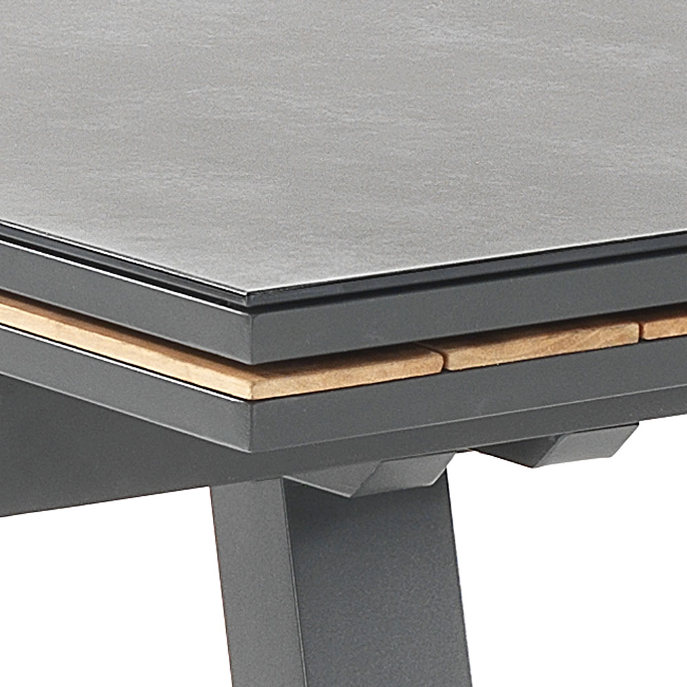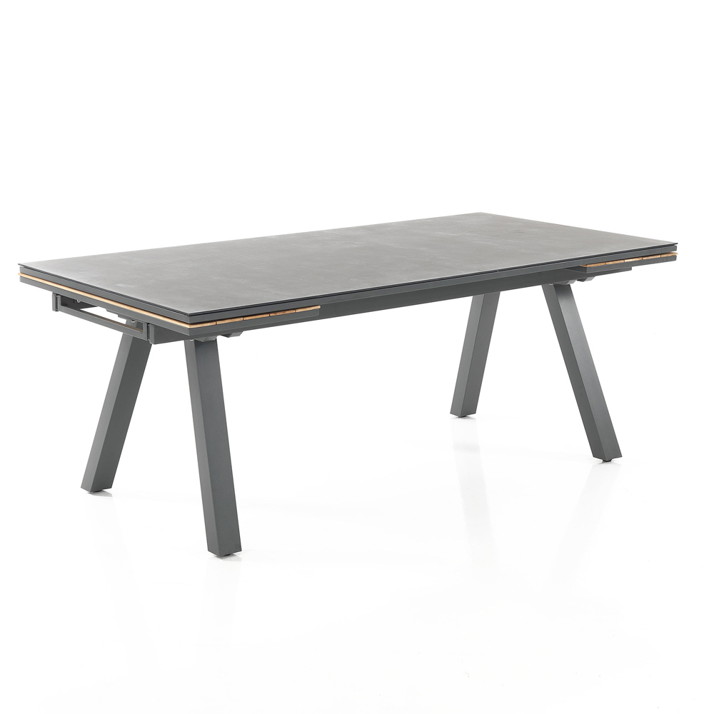 Cette table de jardin extensible est une véritable expression de polyvalence et de style . Le design moderne et les lignes épurées se mélangent à l'élégance des extensions en teck, créant un contraste visuel suggestif qui rehausse la beauté des environnements extérieurs contemporains . La construction robuste en aluminium confère à cette table une stabilité impeccable et une durabilité à long terme .