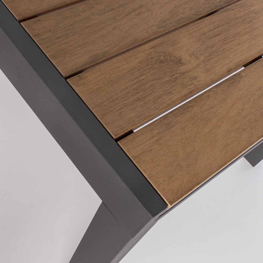 Structure en aluminium enduit de poudre (polyester). Plateau en polywood (matériau composite d'aspect similaire au bois) 90% polystyrène 10% sbs couleur teck. Extension pliable. Vis en acier galvanisé.