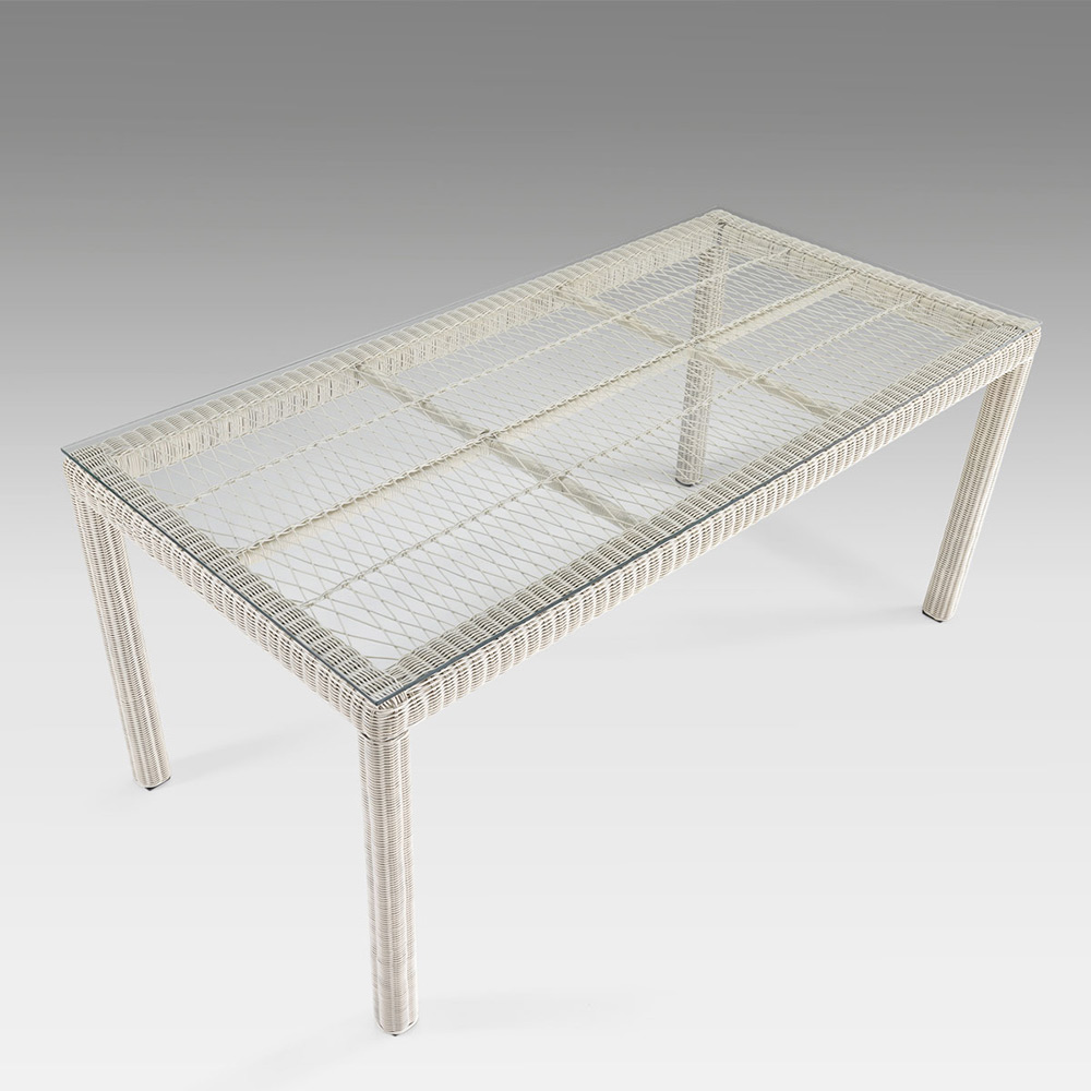 La table d'extérieur rectangulaire Gigi a une structure avec un frame en aluminium thermolaqué , sur laquelle la fibre de Polyrattan de haute qualité de la marque Rehau d'une épaisseur de 3 mm est tressée à la main . En outre, la table est équipée d'un plateau en verre de 8 mm d'épaisseur , qui laisse transparaître la rosace hand-woven.