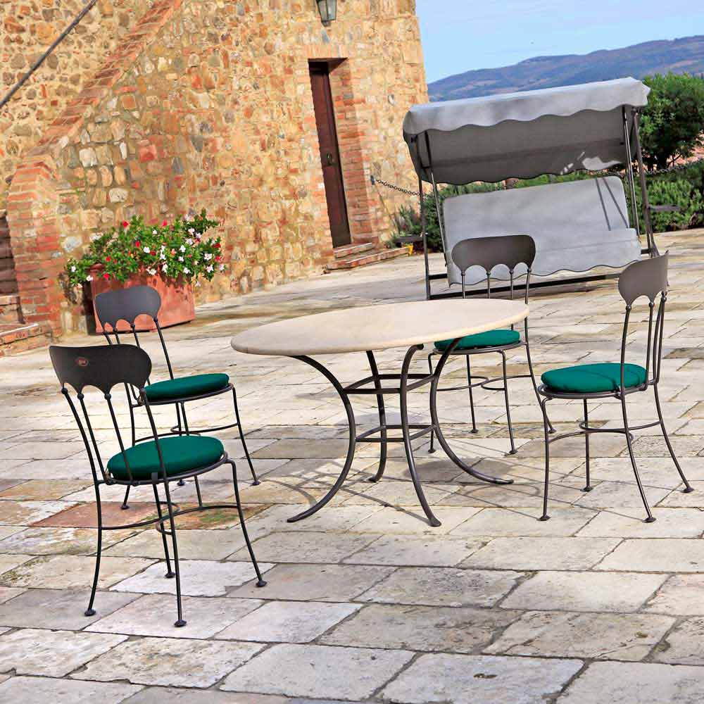 Table à manger d'extérieur fabriquée en Italie avec base en fer peint finition anthracite etplateau rond en travertin clair . Une idée d'ameublement qui rappelle un style plus classique grâce à l'utilisation de matériaux et de finitions avec une âme ancienne. La structure offre au produit une stabilité optimale tandis que le traitement de galvanisation à chaud le rend particulièrement résistant à tout type de corrosion, garantissant l'antirouille du métal pendant des décennies et enrichissant son esthétique d'un revêtement à la texture rugueuse qui rehausse la saveur ancienne de son formes. L'artisanat 100% italien et le souci du détail soulignent encore plus sa valeur et sa valeur, offrant ainsi un produit final de haute qualité capable de caractériser n'importe quel espace extérieur grâce à sa forte personnalité classique et son élégance sans temps du plateau en travertin qui donne à la table son esthétique à l'ancienne.