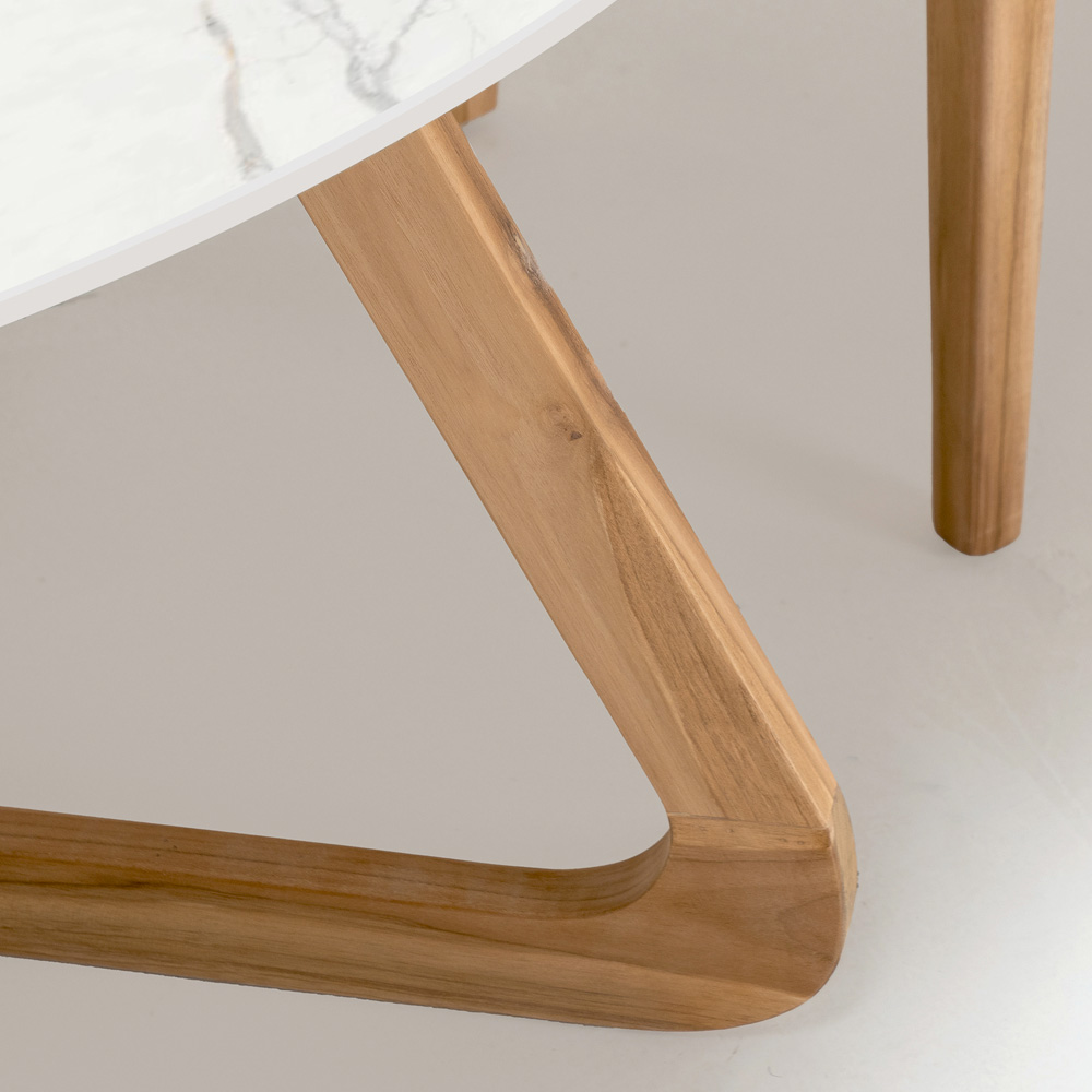 Le piètement en bois soutient solidement le plateau en céramique robuste et apporte une touche de chaleur naturelle, créant un contraste visuel captivant avec le plateau en marbre brillant. Cette combinaison est non seulement esthétique , mais offre également durabilité et résistance aux intempéries , rendant la table idéale pour une utilisation quotidienne en extérieur.
