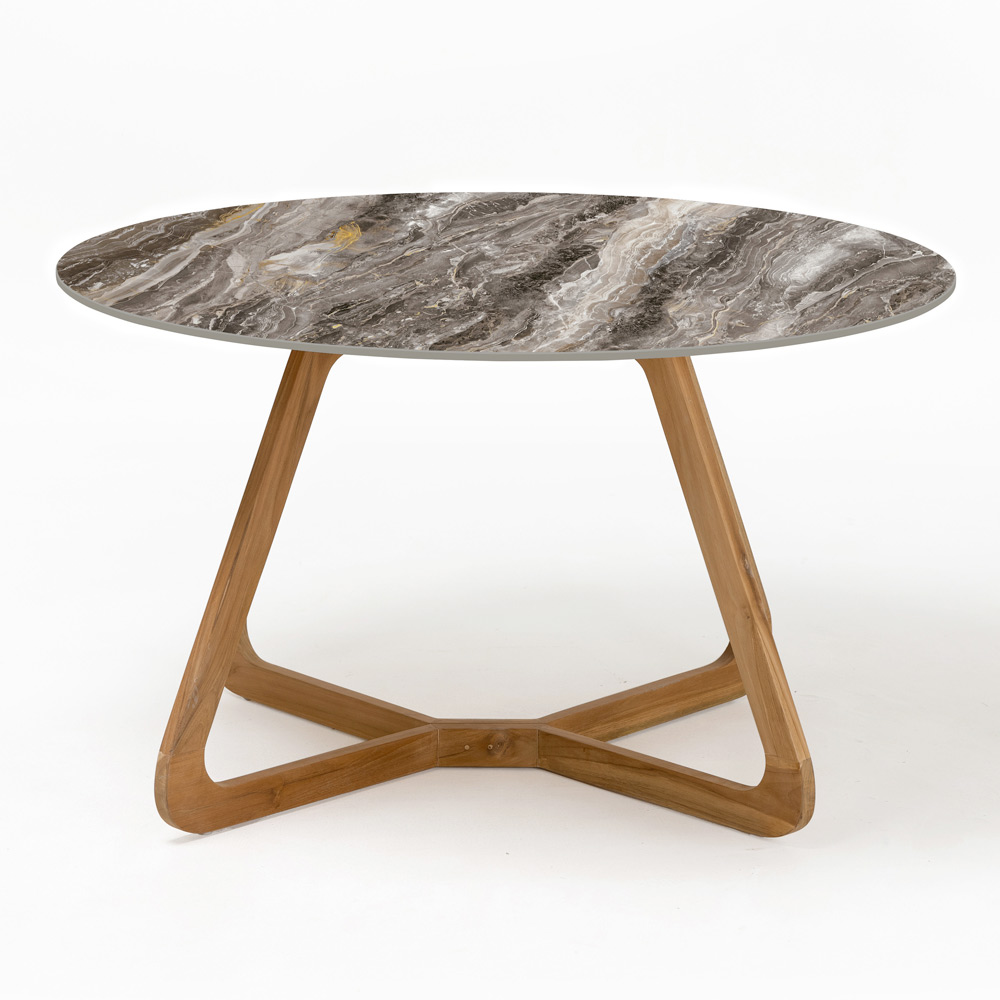 Le piètement en bois apporte une touche chaleureuse et naturelle, contrastant harmonieusement avec le veinage riche et les textures complexes du plateau en céramique. Cette combinaison est non seulement esthétique, mais offre également une solidité structurelle qui assure durabilité et résistance aux intempéries.