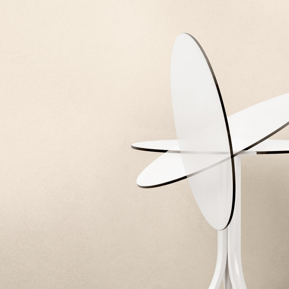 Caractéristiques techniques et matériaux: La potence à trois branches et pliable est en aluminium enduit de poudre époxy , combiné avec le plateau rond en stratifié HPL de 10 mm d'épaisseur.