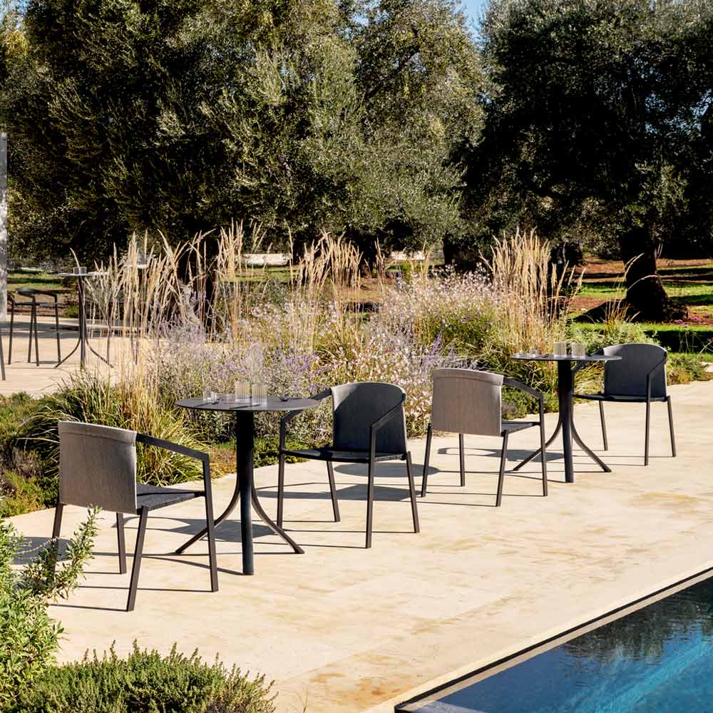 La collection se caractérise par le détail du pied en aluminium comme point focal combiné à une rigueur formelle, pour vivre le plein air en termes de détente et de convivialité maximum, assis sur le canapé, autour d'une table ou allongé sur le transat.