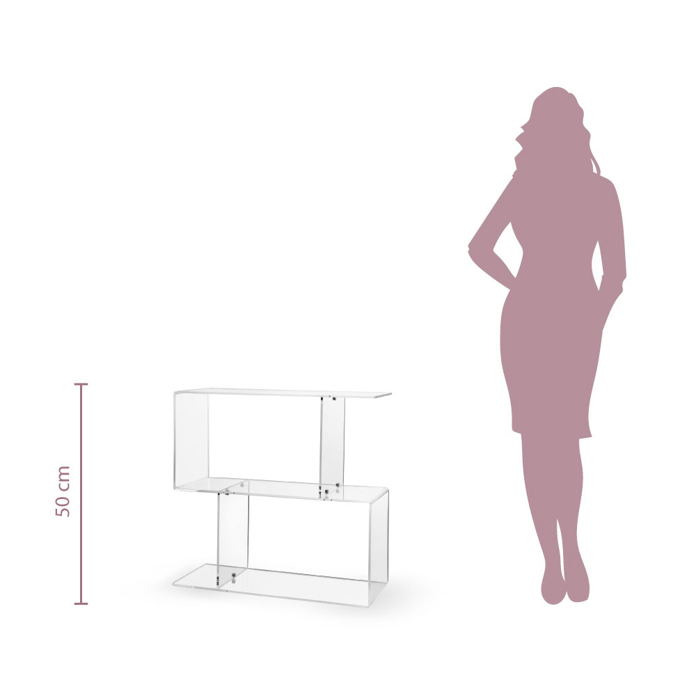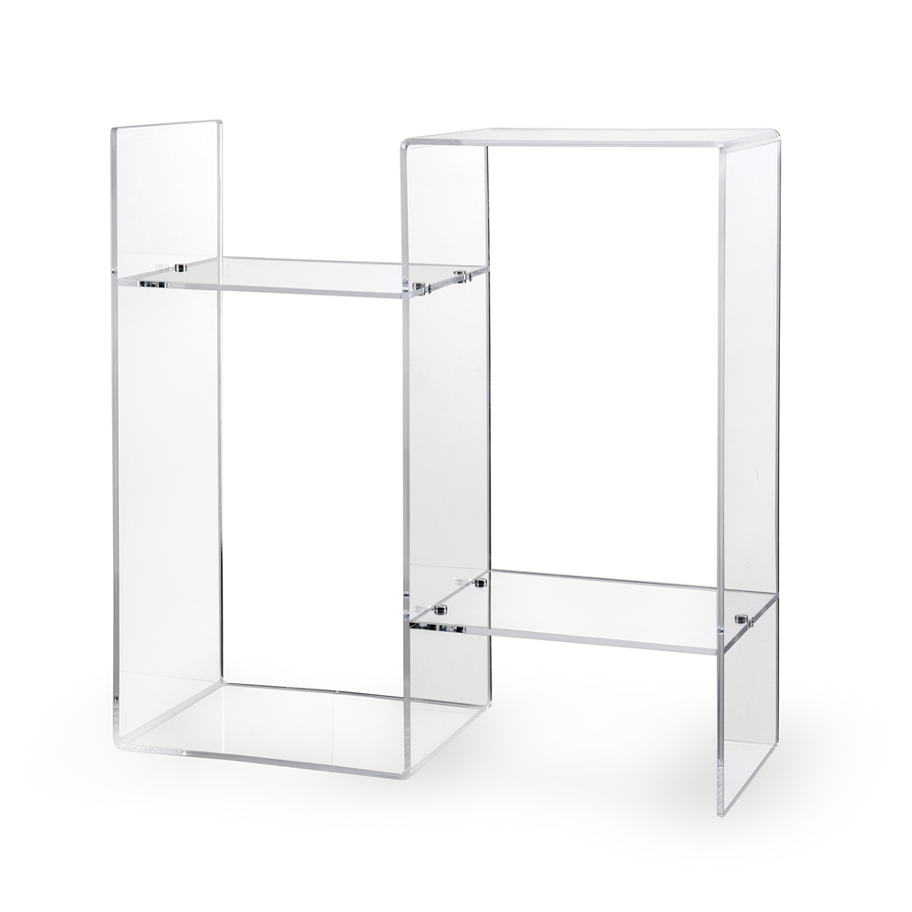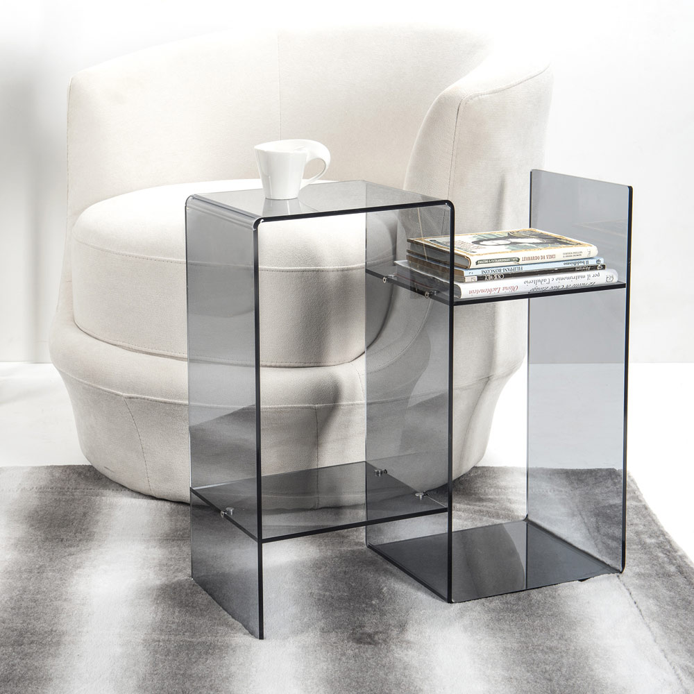 Table basse pour côté de canapé entièrement fabriquée en Italie grâce à l'utilisation de plexiglas , un matériau innovant idéal pour la production d'accessoires d'ameublement car il est non toxique, hypoallergénique, inodore, antibactérien et 100% recyclable. Son design discret et linéaire possède une double étagère pour plus de fonctionnalité et met en valeur son éclat et sa brillance qui restent constants et inchangés dans le temps.