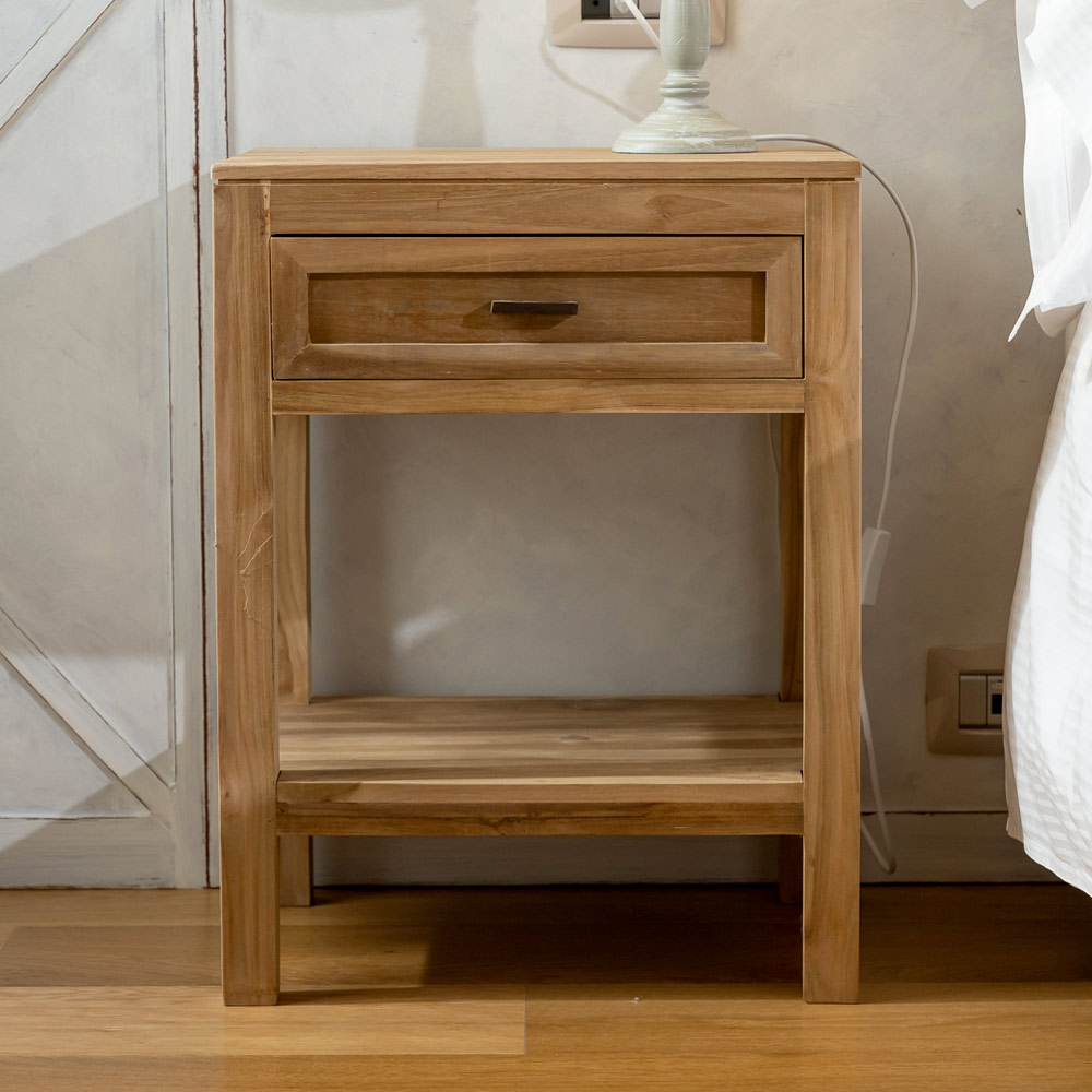Cette table de chevet en teck massif est un meuble simple et fonctionnel, idéal pour la chambre ou comme buffet dans d'autres pièces de la maison. Son travail artisanal et le grain naturel du bois lui confèrent un aspect chaleureux et authentique, parfait pour un style intemporel.