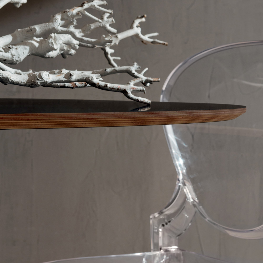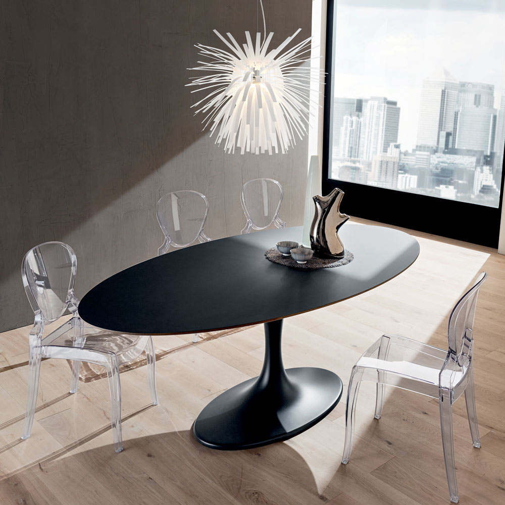 Table à manger fabriquée en Italie avec plateau ovale en contreplaqué de bouleau avec surface plaquée en finition fenix noir et base en marbre minéral (marbre synthétique). Un style extrêmement original et créatif caractérise ce meuble à l'âme élégante et à l'esthétique presque futuriste capable de rendre unique n'importe quel environnement grâce à sa personnalité particulièrement innovante . Les lignes inhabituelles qui parcourent toute la base se marient parfaitement avec la forme ovale du plateau, créant ainsi une sensation de mouvement et une splendide harmonie des formes . Le contraste particulier entre le plateau en contreplaqué et le placage en fenix enrichit encore plus le design final de la table, la rendant particulièrement adaptée à ceux qui aiment meubler leurs espaces de manière sophistiquée et complètement révolutionnaire. Les matériaux de haute qualité utilisés et la fabrication 100% Made in Italy augmentent sa qualité et sa valeur, nous permettant ainsi d'offrir une solution d'ameublement aussi belle et élégante que solide, résistante et fonctionnelle.