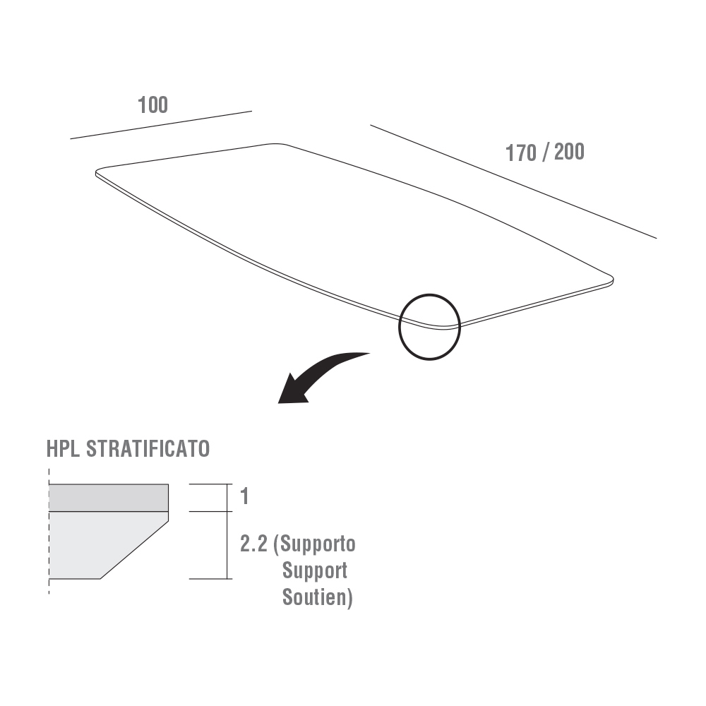 Table de cuisine avec plateau en hpl stratifié (épaisseur 10 mm) stratifié en forme de tonneau et soutenu sur une dalle en mdf et
