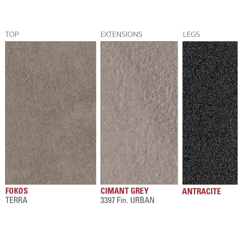 aluminium laqué époxy finition anthracite. Sa particularité est représentée par le plateau en laminam, une