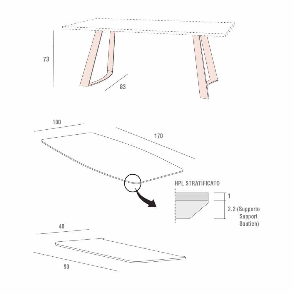 NB : le plateau et le piètement sont disponibles dans une vaste gamme de matières et de finitions différentes. La continuité du grain entre le plateau et la rallonge n'est pas garantie