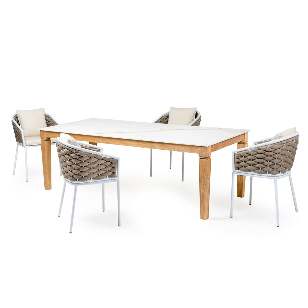Composition de table en teck avec 4 chaises en teck, tissu tissé et bois.