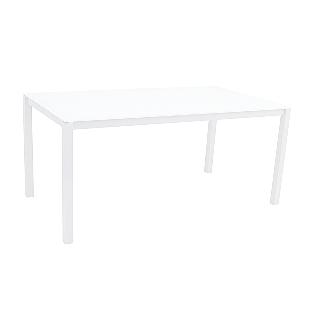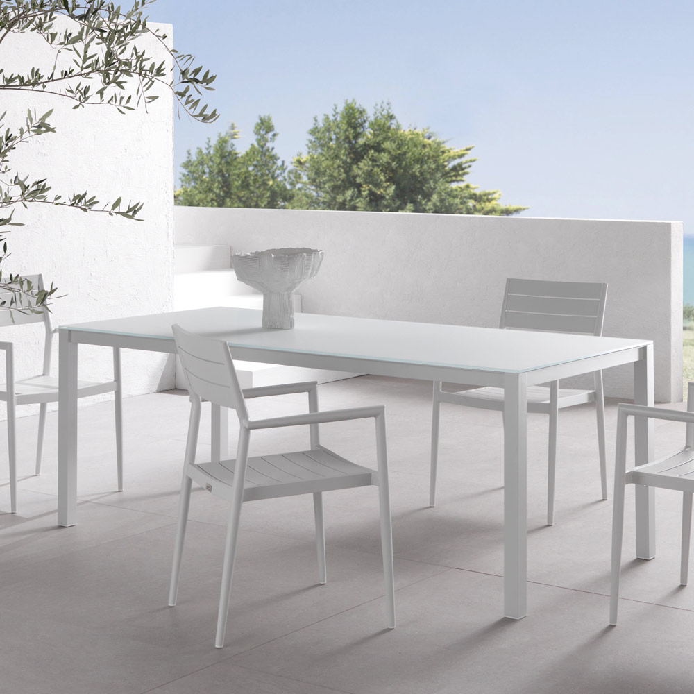 Table à manger de jardin avec structure en aluminium enduit de poudre époxy et plateau en verre peint à l'arrière