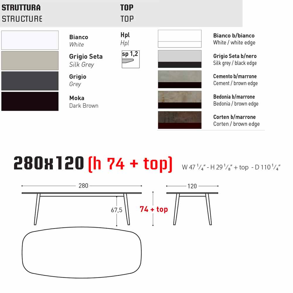 Ellisse est une table d'extérieur fixe dotée d'une structure en aluminium à revêtement en poudre, disponible en quatre couleurs: blanc, gris soie, gris et moka ; avec plateau en HPL (sp 1.2) en finition: bordure noir gris soie, bordure noir blanc, bordure noir anthracite, bordure blanc blanc, bordure marron ciment, bordure marron bedonia, bordure marron corten ; ou avec un plateau en céramique bouchardé (sp 1.2) en finition: chaux blanche et porphyre gris .