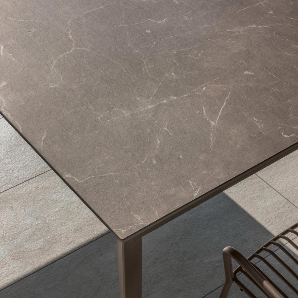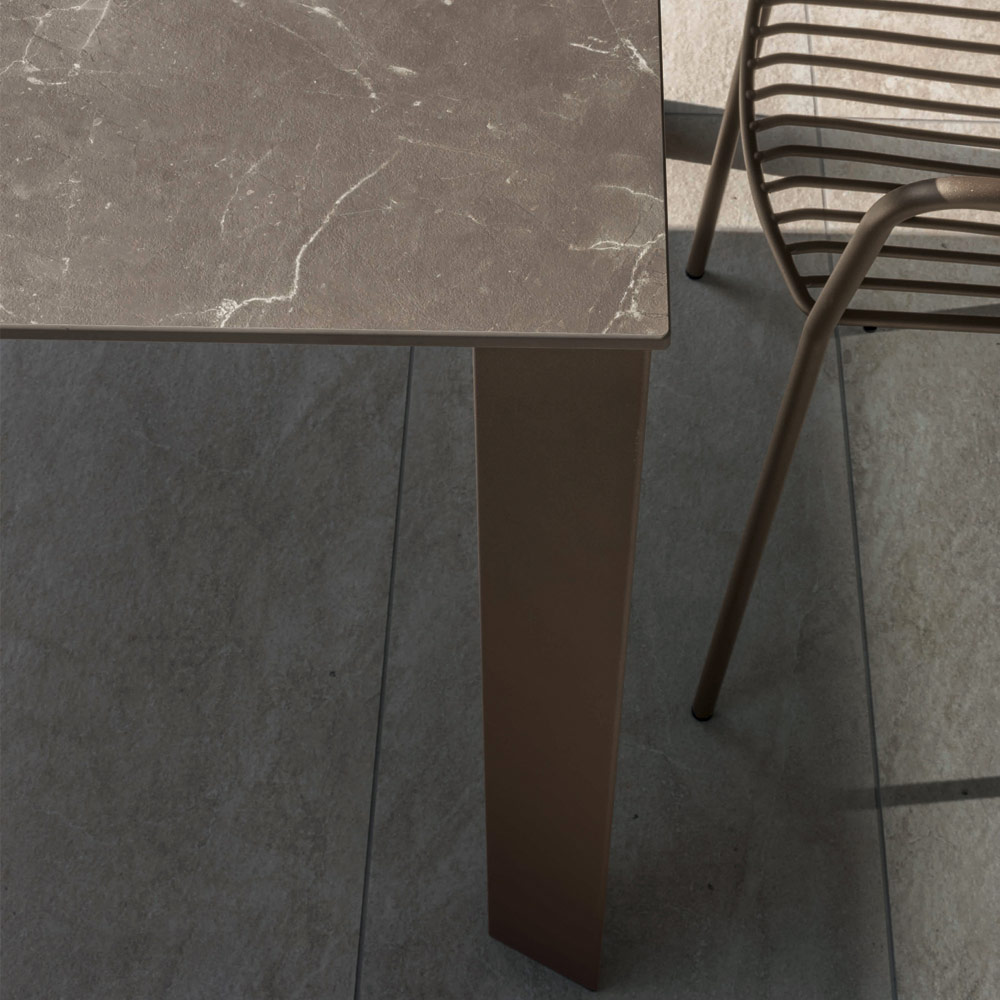 Table de jardinavec structure en métal verni bronze gaufré et plateau rectangulaire en hpl . Un meuble fabriqué à la main en Italie avec des matériaux de haute performance résistants aux agents atmosphériques qui garantissent un résultat fonctionnel et durable avec une esthétique contemporaine , élégante et raffinée .