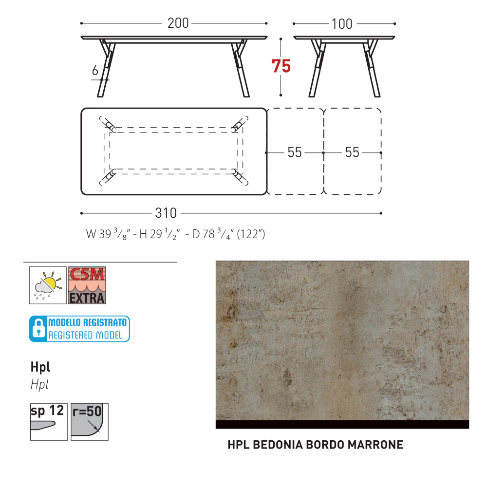 100x200/310xH73,2 cm - 2 rallonges de 55 cm chacune
