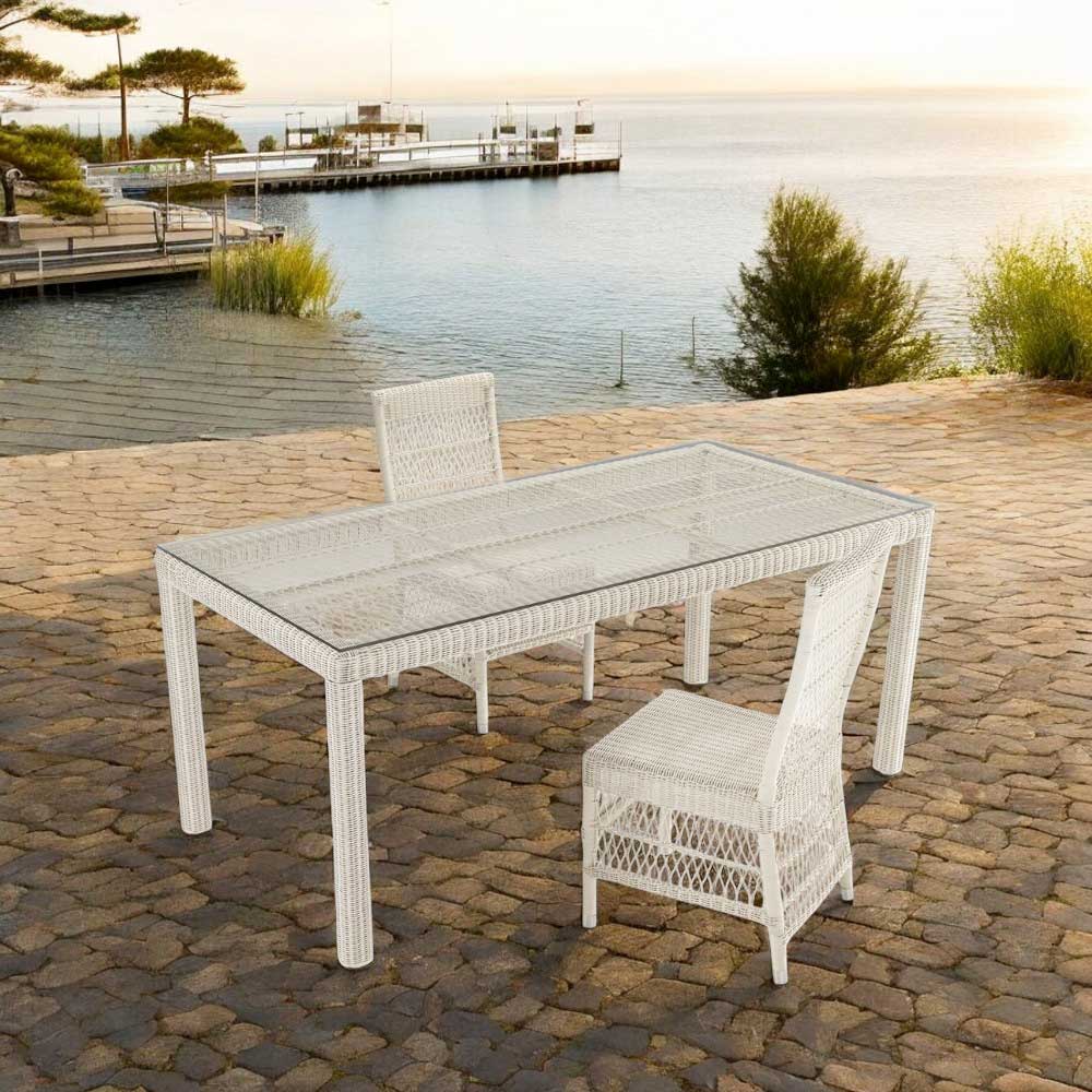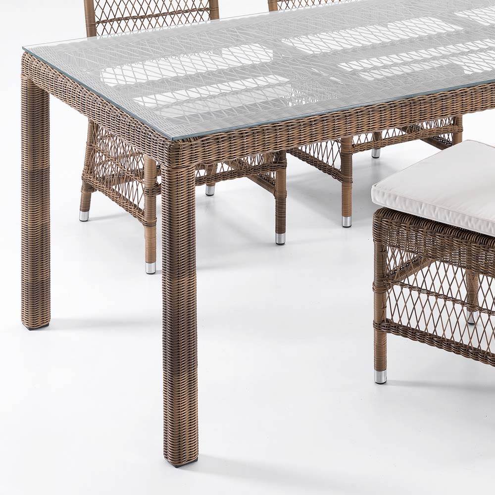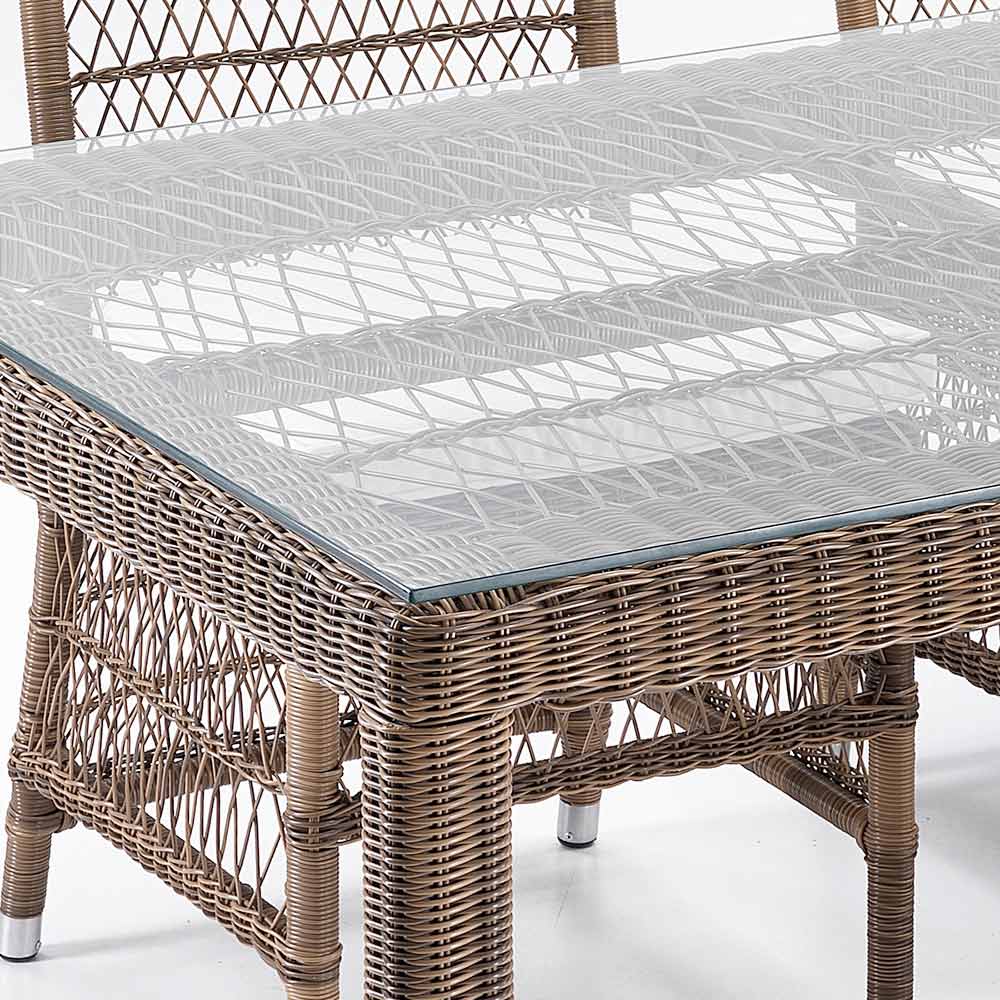 plateau en verre, 4 chaises et 2 fauteuils avec accoudoirs avec structure en aluminium et tissage Polyrattan de marque REHAU. Cette composition se caractérise par son fort