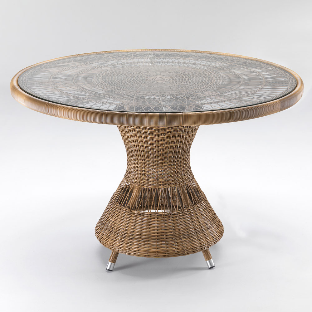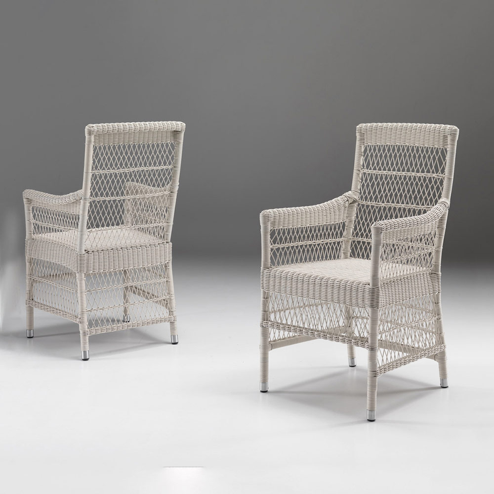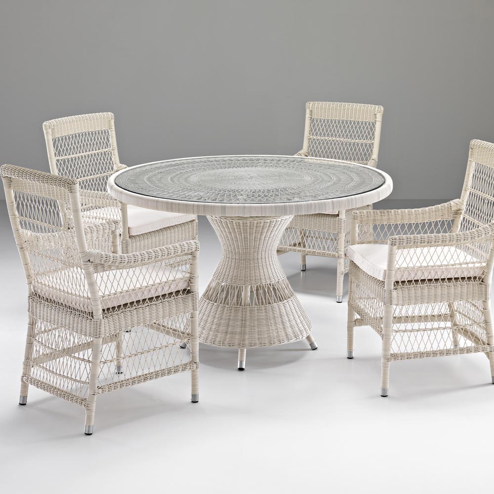 plateau en verre, 4 fauteuils avec accoudoirs avec structure en aluminium et tissage Polyrattan marque REHAU. Cette composition se caractérise par son fort