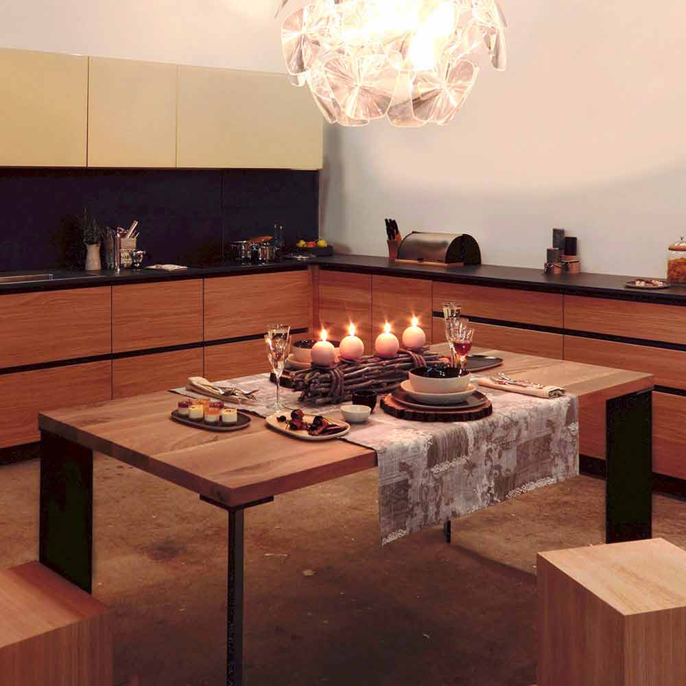 La table fixe Yvonne se caractérise par un plateau en noyer italien naturel peint avec un effet naturel, des pieds en anthracite, un revêtement en poudre.