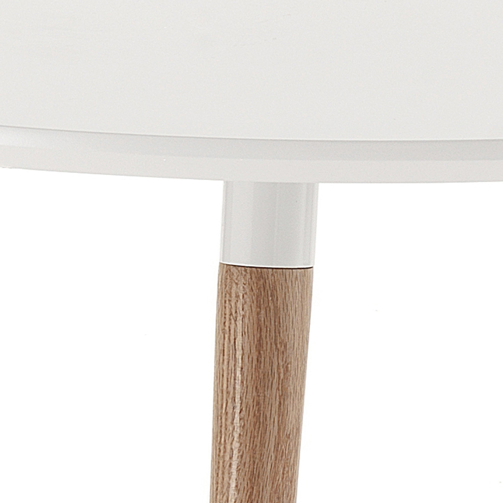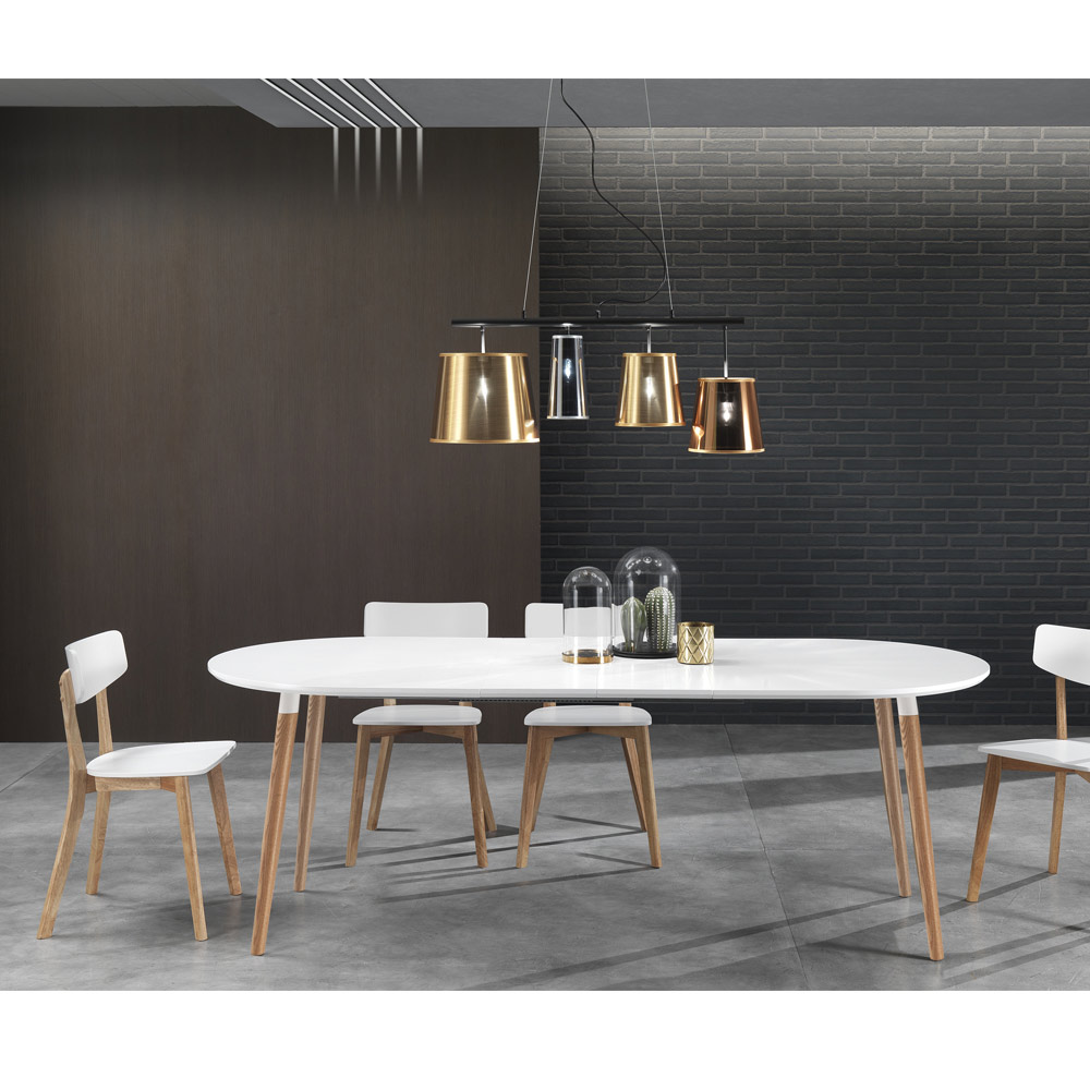 Table à manger ronde avec plateau en mdf laqué blanc mat et pieds en bois massif finition chêne. Un produit au design simple et épuré, idéal pour ceux qui aiment un style de mobilier essentiel et polyvalent capable de compléter le style de leur salle à manger ou de leur cuisine avec goût et personnalité. Son point fort est représenté par le plateau extensible qui, grâce à deux rallonges de 50 cm chacune, atteint une longueur de 170 ou 220 cm.