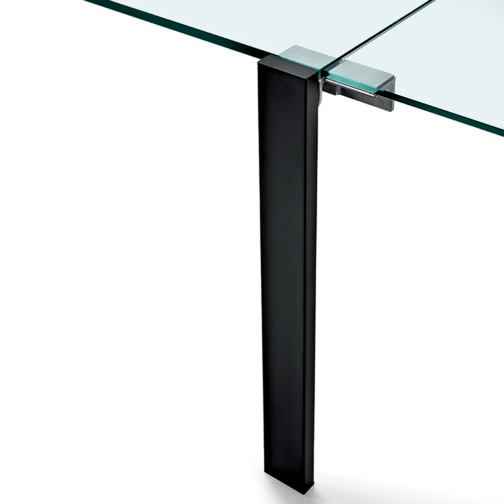 Table en verre extra-clair extensible jusqu'à 170 cm avec piètement en métal, fabriquée en Italie.