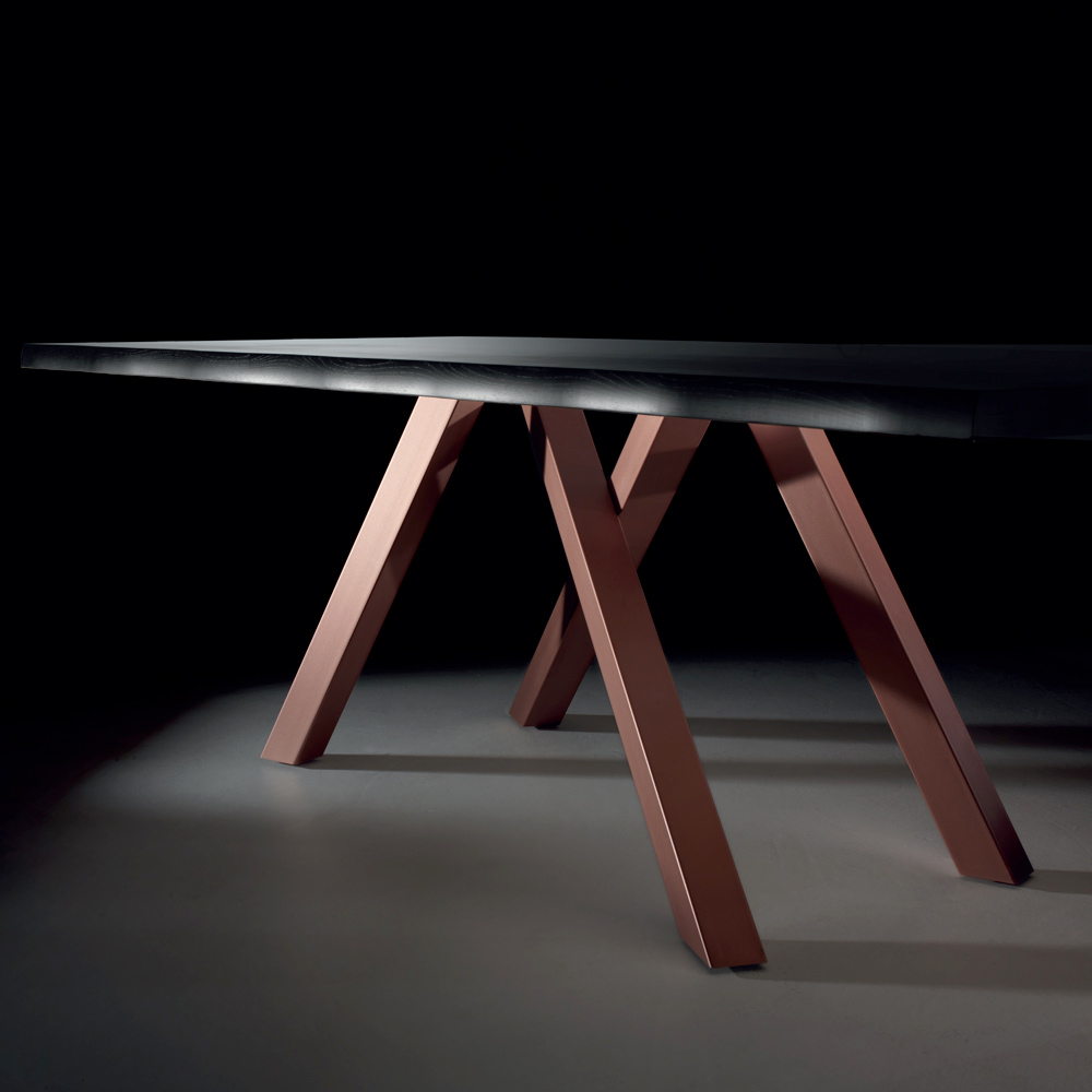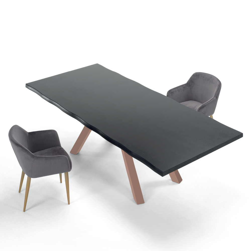 Table de cuisine moderne avec plateau en bois plaqué et base en acier doré, or rose ou graphite fabriquée en Italie.