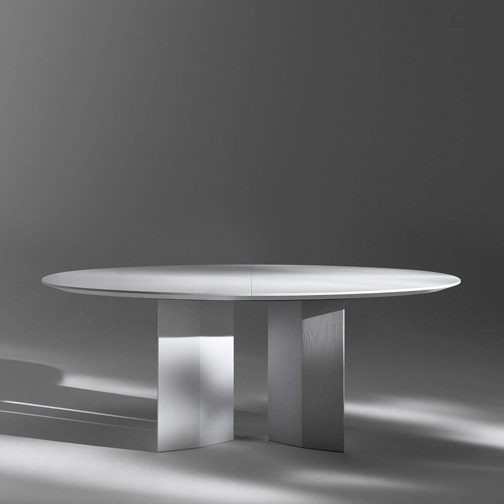 Cette table de salle à manger ovale se distingue par son design sculptural et épuré, où des volumes généreux et des proportions équilibrées créent un meuble visuellement saisissant. Le plateau ovale dialogue avec le piètement central, formant une composition solide et harmonieuse, idéale pour les espaces contemporains et raffinés.