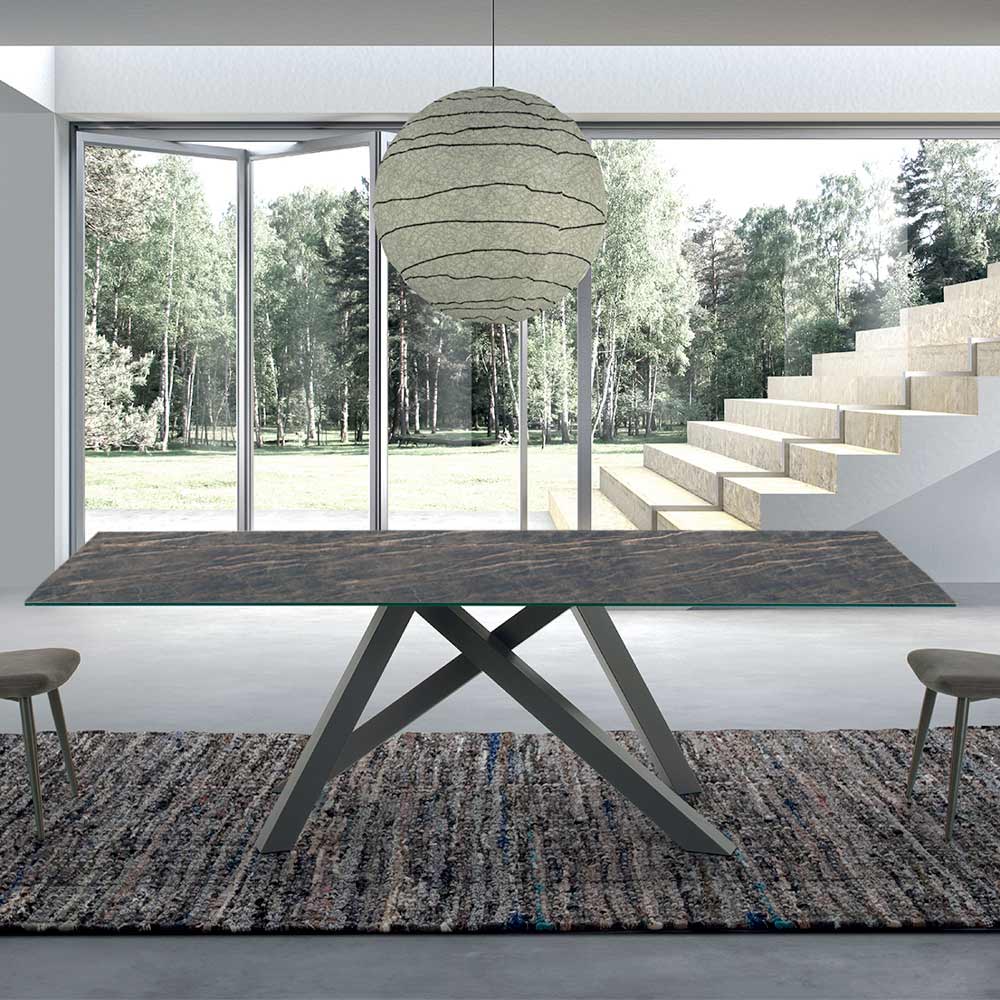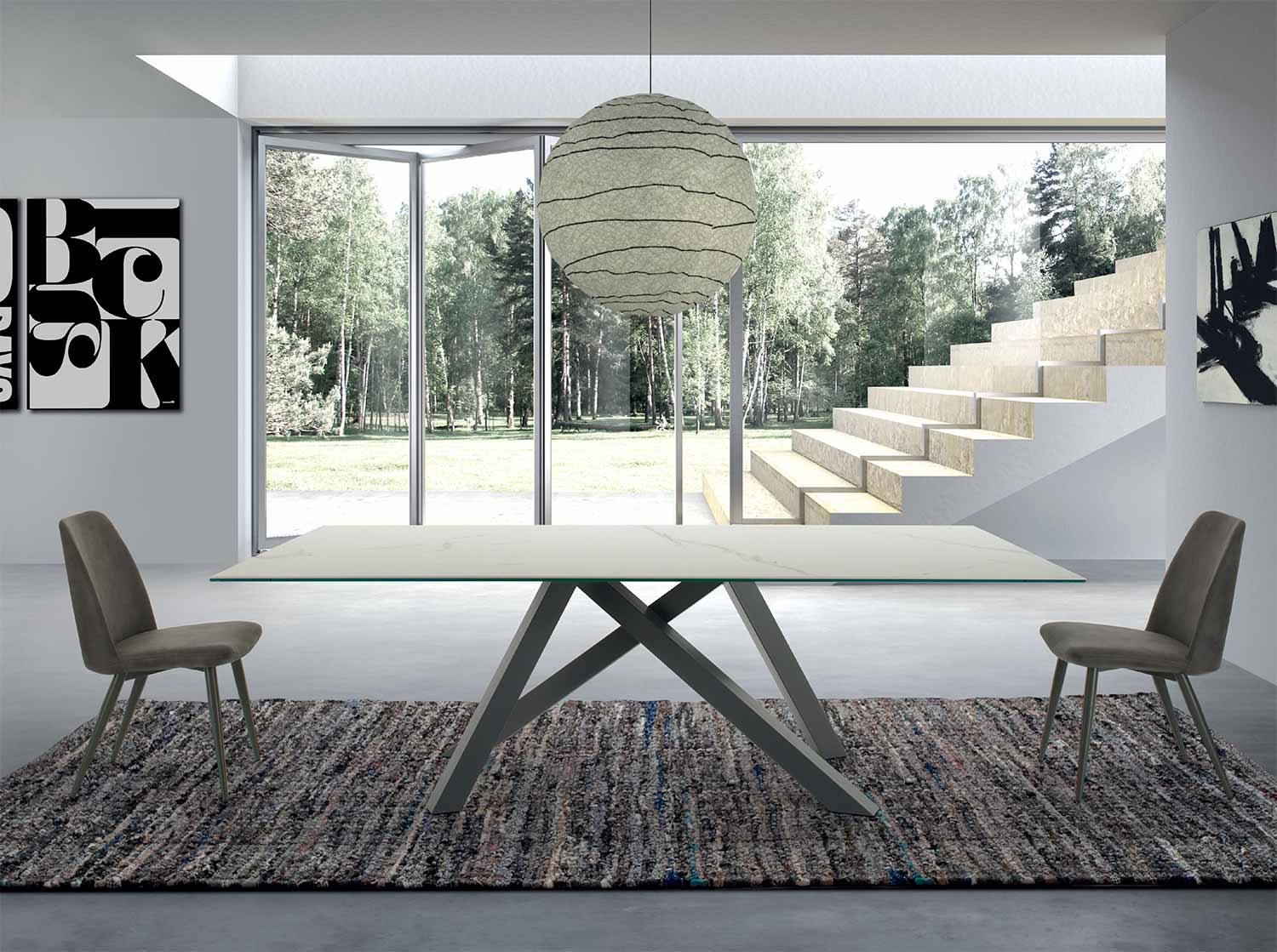 Table avec plateau en céramique et base en acier gris tourterelle de design moderne fabriquée en Italie.