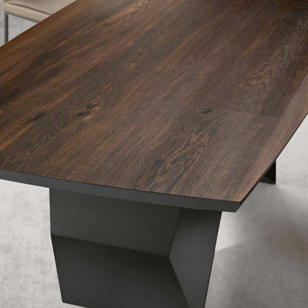 Les pieds en métal , présentant une forme géométrique audacieuse, sont peints pour contraster magnifiquement avec le ton du bois. Cette combinaison de matériaux offre non seulement une solide stabilité, mais ajoute également un élément visuel percutant, faisant de cette table un véritable point central dans toute salle à manger ou espace ouvert.
