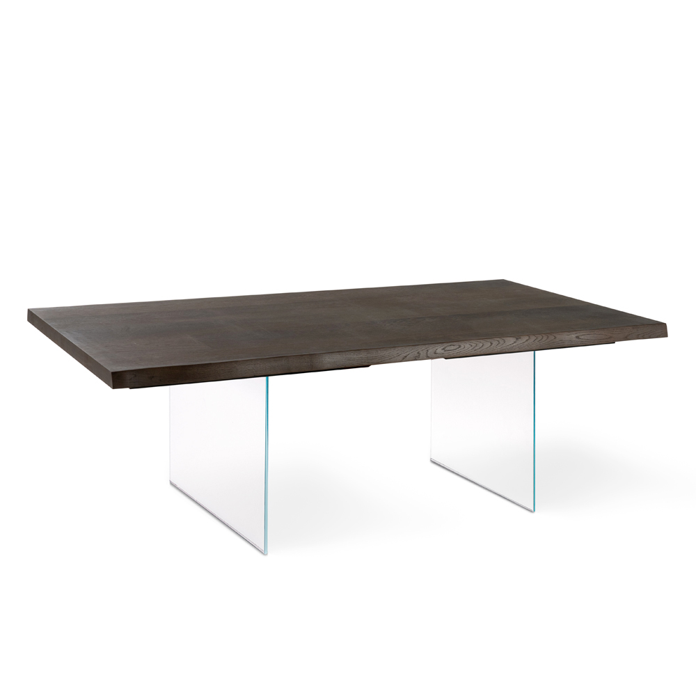 Table de salon fixe avec plateau en placage de chêne , pieds en verre trempé extra transparent.