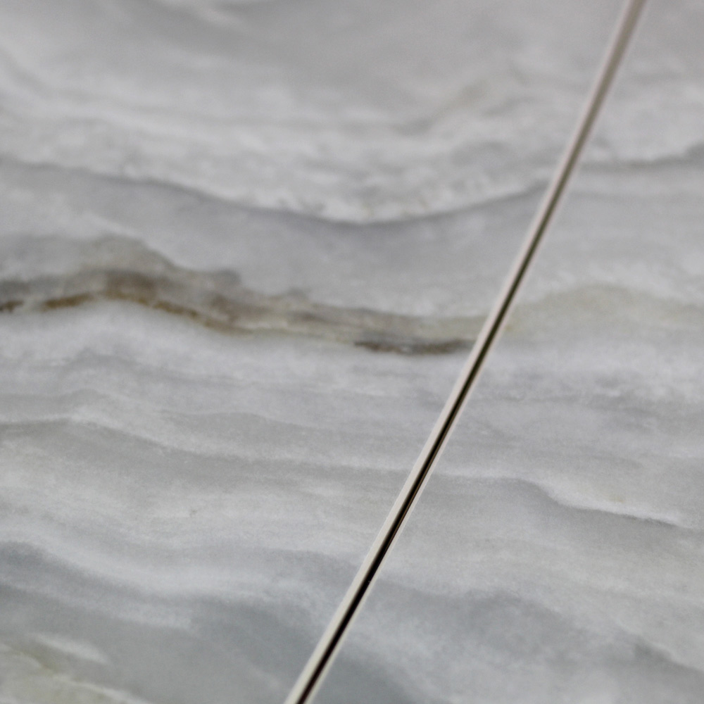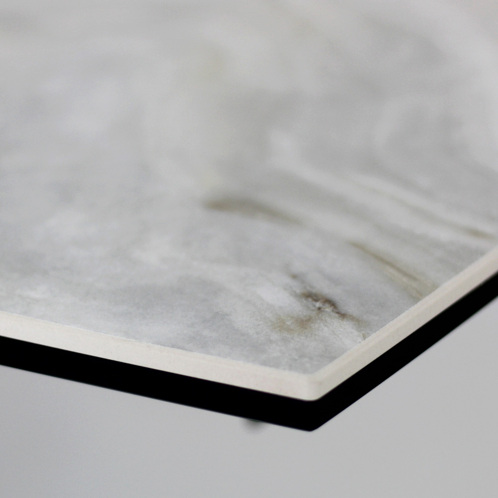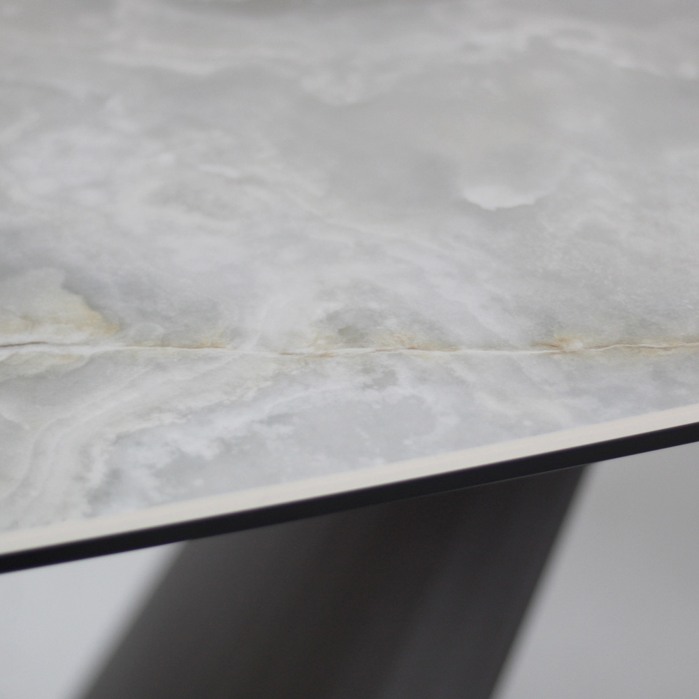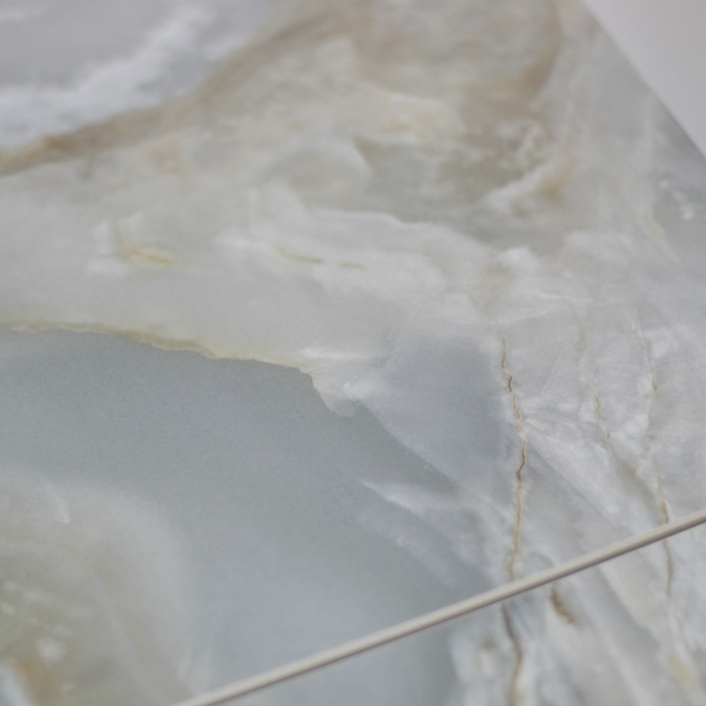 piètement champagne, plateau calacatta or veiné brillant (verre épaisseur 10 mm + céramique 5 mm)