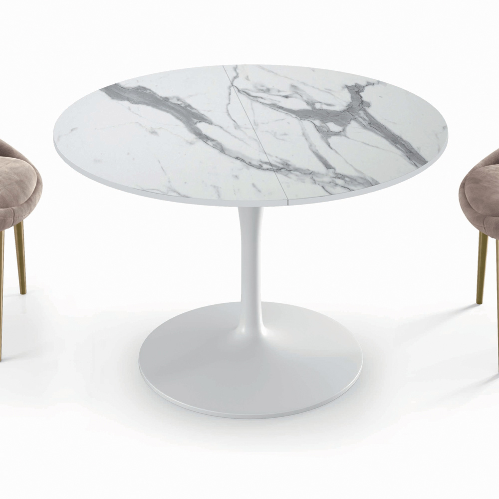 Table de salon extensible avec rallonges séparées à insérer,plateau en stratifié finition statuaire mate, bord biseauté à 45° , piètement en fonte d'aluminium laqué blanc brillant. La chaîne de produits, de la conception à la production, jusqu'au contrôle de qualité, est entièrement réalisée en Italie , afin de garantir et de préserver la caractéristique typique du « savoir-faire » italien et l'importance du typique Made in Italy. Ce produit au style moderne a pour objectif premier de pouvoir être utilisé au quotidien sans sacrifier le design.