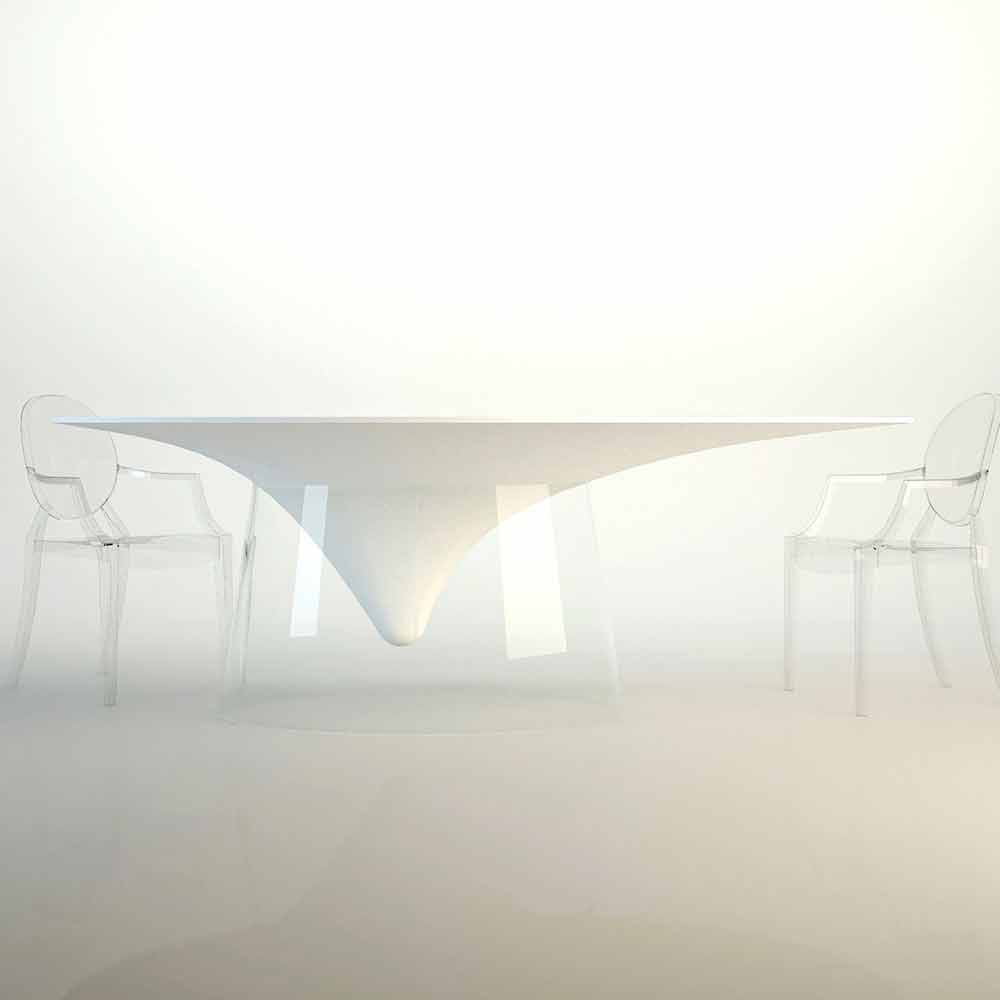 Fabriqué avec un plateau elliptique en Solid Surface® qui glisse à l'intérieur d'une base en cristal transparent qui interprète un vase dans lequel la fleur est placée.
