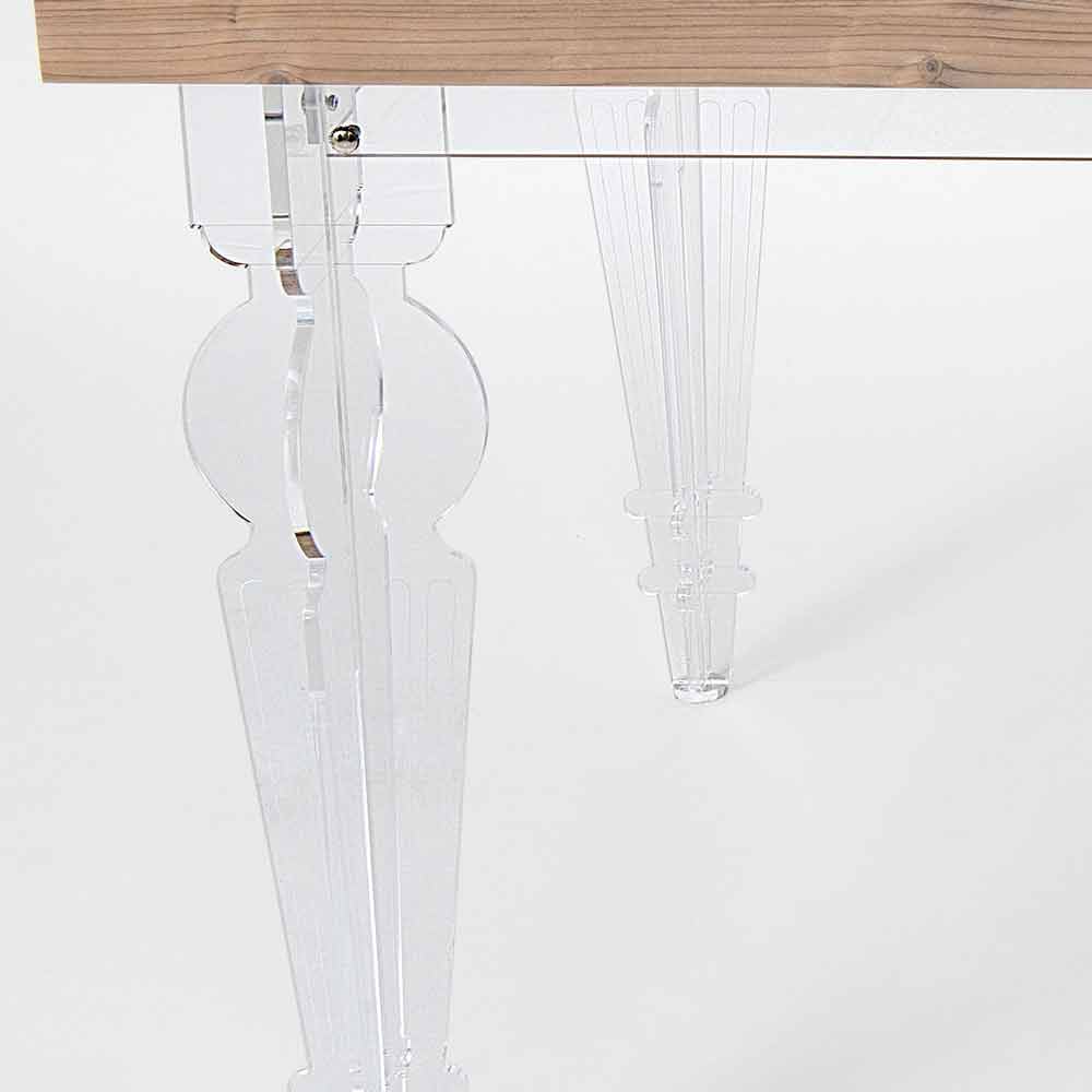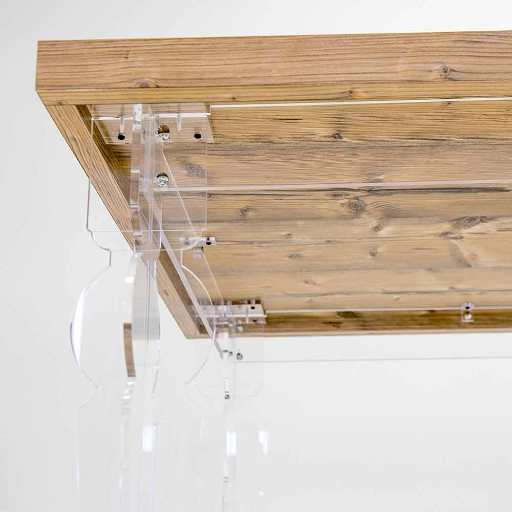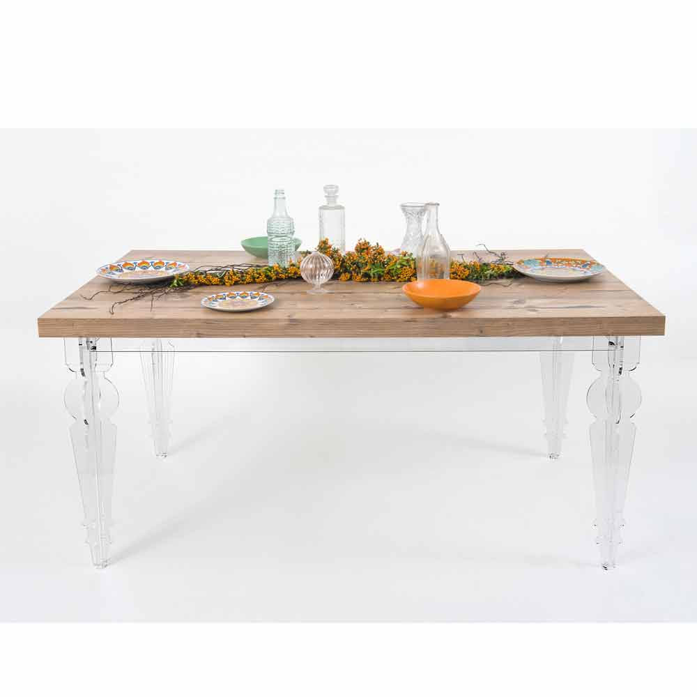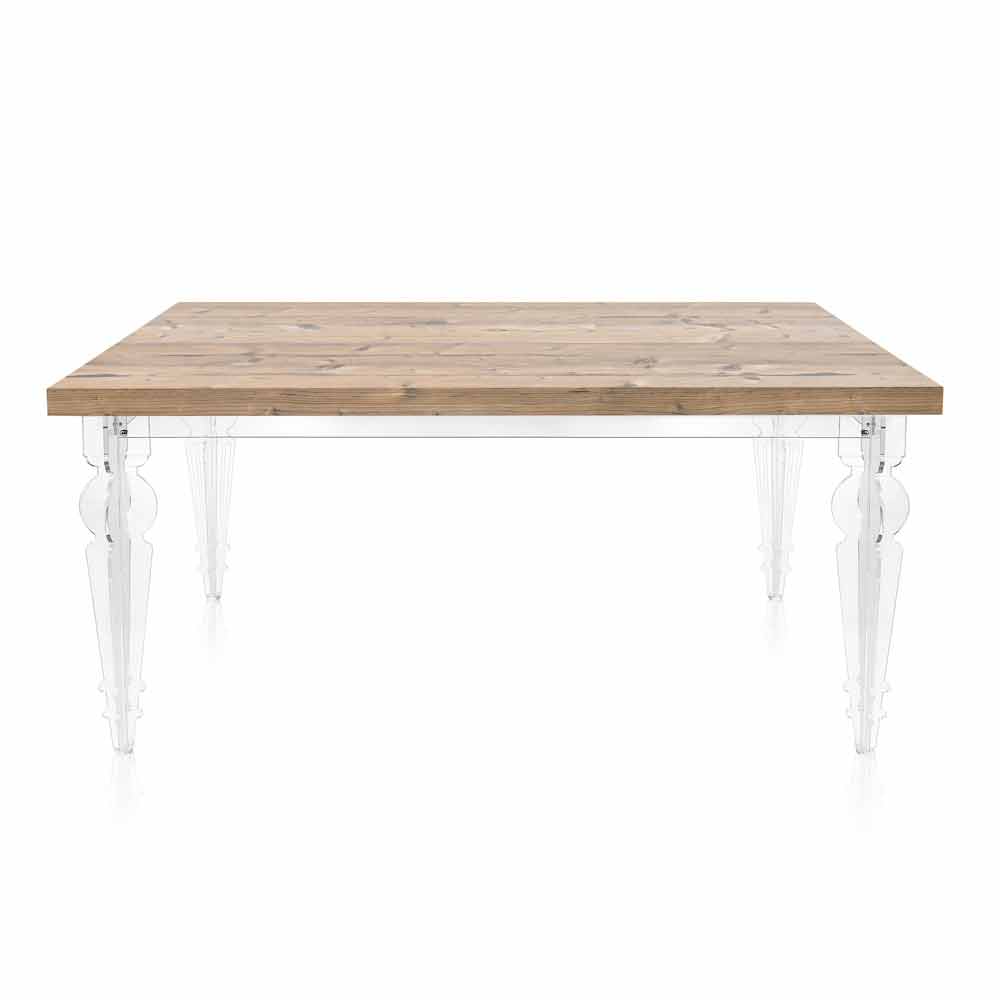 Table fixe en bois de sapin et plexiglas fabriqué en Italie, Castro Castro est le résultat parfait de la combinaison de deux excellents matériaux: des pieds en PMMA pur cristal acrylique et un plateau en épicéa foncé au fini brossé naturel mat.