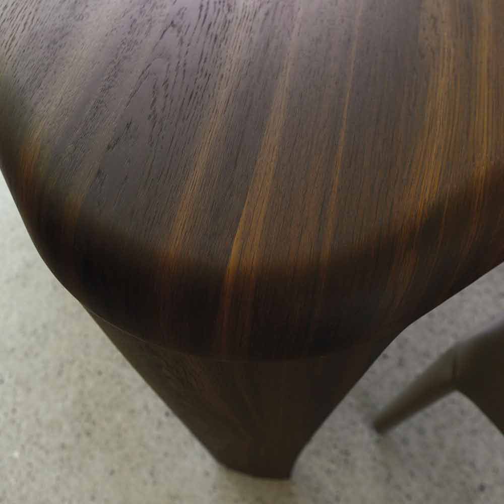 Une table réalisée en bois, suivant un schéma libre, où les lignes sont doucement courbées et libres de tout bord.