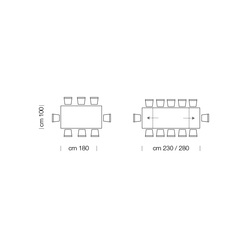 L 180 (280) x P 100 x H 75,3 cm 12 places extensibles par 2 rallonges extérieures de 50 cm ;