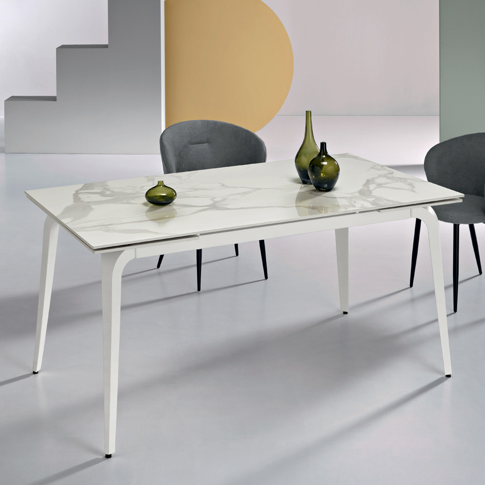 Table de salle à manger extensible au design moderne, idéale pour aménager avec élégance le salon ou la salle à manger . Son plateau est en pierre frittée effet marbre , un matériau durable et facile d'entretien qui apporte une touche contemporaine à tout espace.