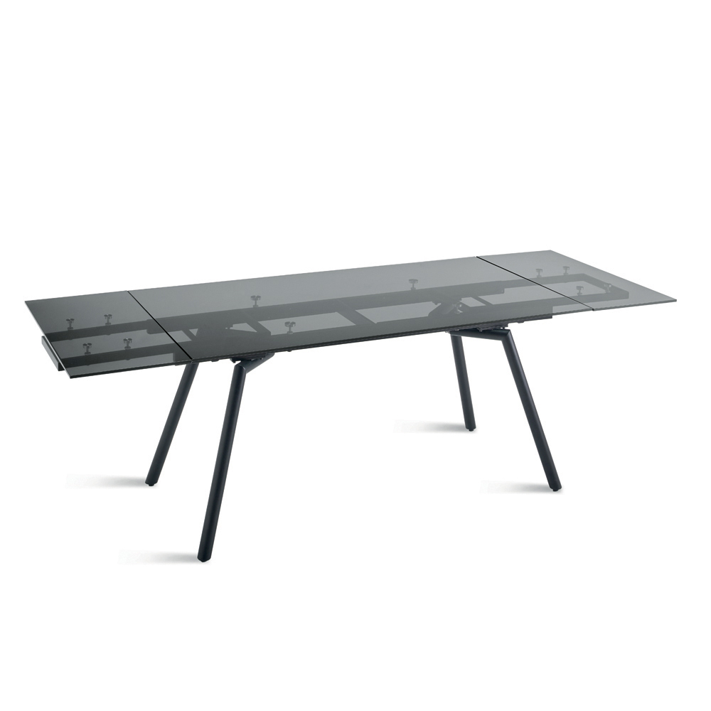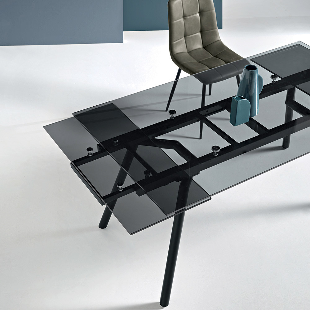 Une table à manger extensible élégante et moderne, idéale pour aménager avec style votre salle à manger ou votre salon . Son plateau en verre fumé apporte luminosité et légèreté à l'espace, tandis que son piètement en métal peint en noir assure stabilité et durabilité, créant ainsi un équilibre parfait entre esthétique contemporaine et fonctionnalité.