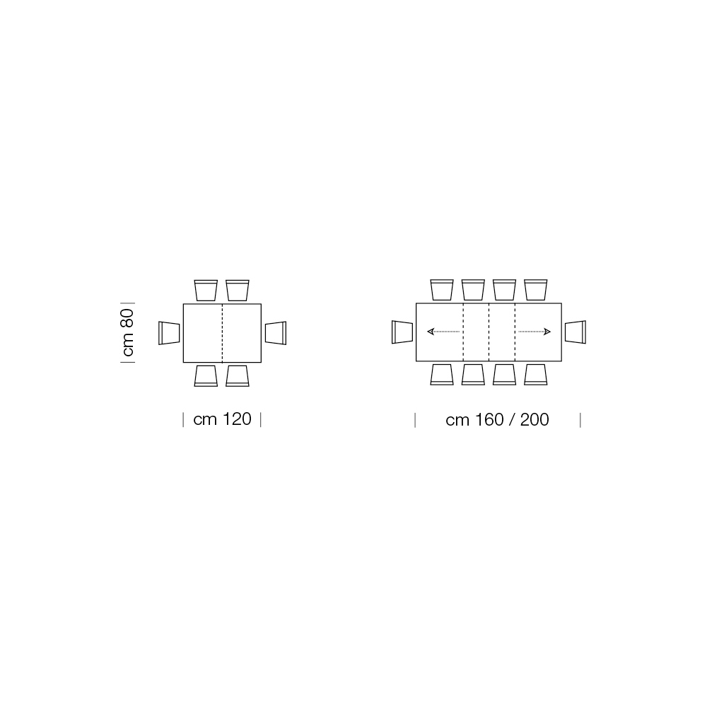 - L 120 (200) x P 80 x H 77 cm 10 places extensibles avec deux rallonges internes de 40 cm ;