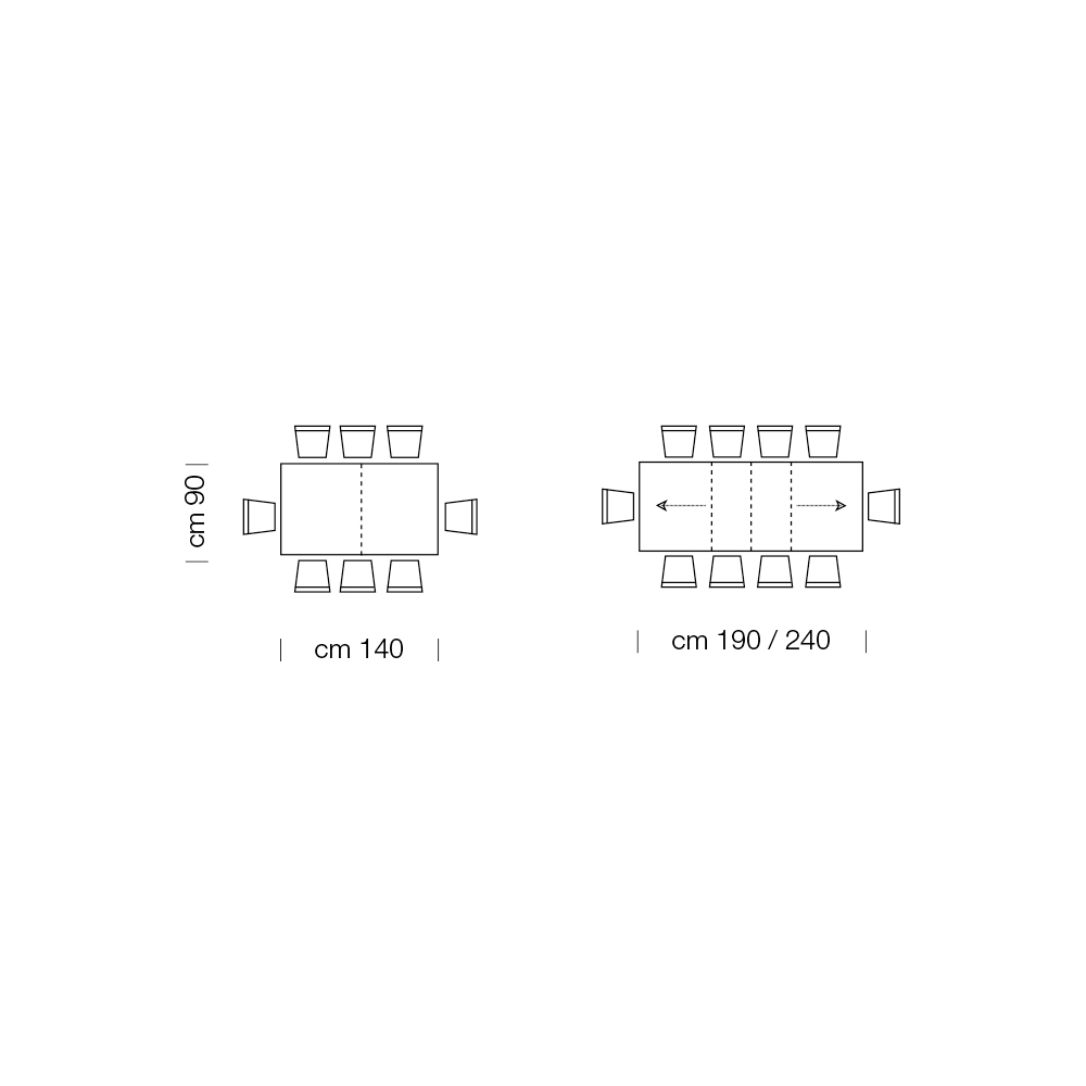 - L 140 (240) x P 90 x H 77 cm 10 places extensibles avec deux rallonges internes de 50 cm chacune ;