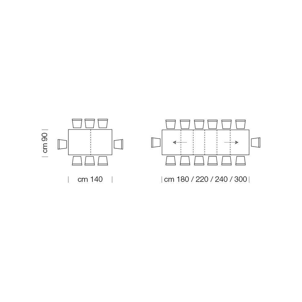 - L 140 (300) x P 90 x H 77 cm 14 places extensibles avec quatre rallonges internes de 40 cm ;
