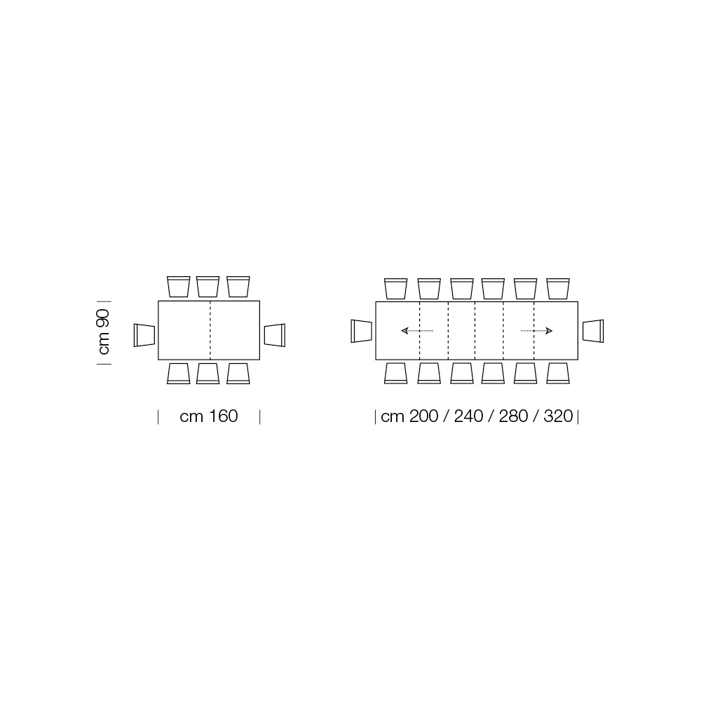 - L 160 (320) x P 90 x H 77 cm 14 places extensibles avec quatre rallonges internes de 40 cm ;