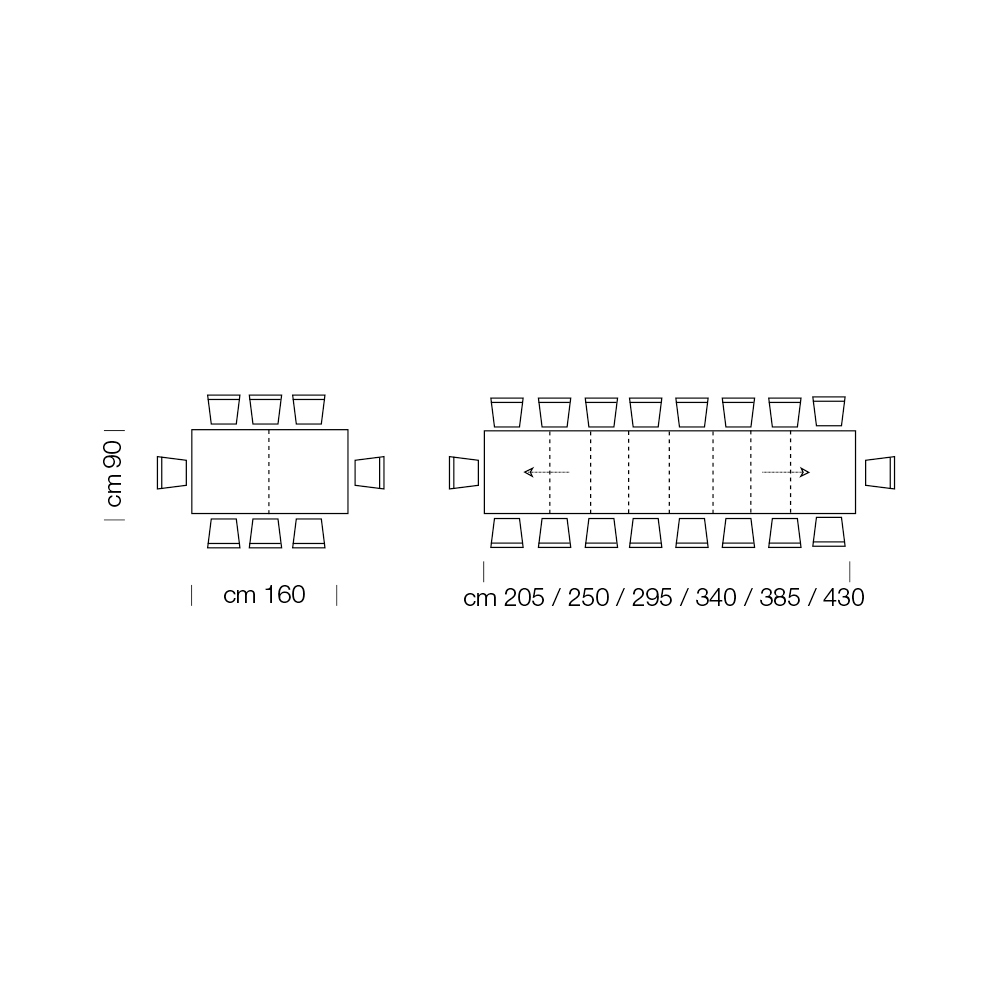 - L 160 (430) x P 90 x H 77 cm 18 places extensibles avec six rallonges de 45 cm, trois internes et trois fournies dans une boîte en carton réutilisable ;