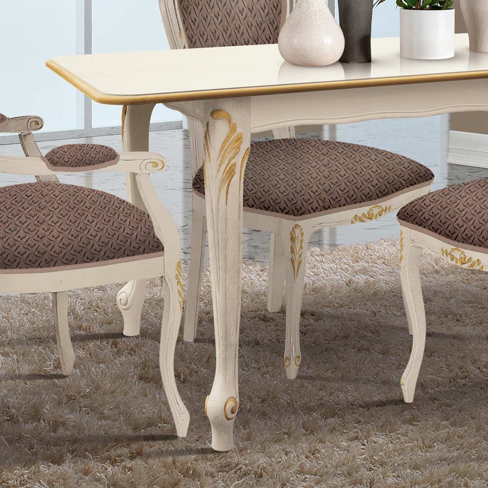 Table extensible pour salle à manger de style classique fabriquée en Italie en bois blanc avec des détails dorés. La table possède deux rallonges internes de 40 cm chacune qui permettent de l'allonger de 140 à 220 cm. Entièrement fabriqué en Italie et fabriqué à la main par des maîtres artisans qualifiés , fini avec sagesse et goût pour l'élégance. La production est réalisée en utilisant des matériaux nobles et en réalisant le travailà la main avec le plus grand soin et le professionnalisme qui distinguent les produits Made in Italy .