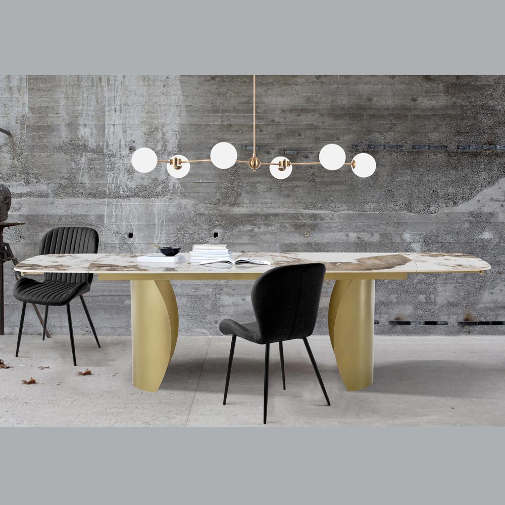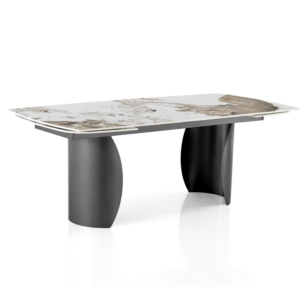 Cette table extensible est une sublime expression de luxe et de fonctionnalité . Le plateau en céramique effet marbre, caractérisé par de complexes veines multicolores, repose sur une double base, qui non seulement assure la stabilité mais ajoute une touche d' élégance sophistiquée .