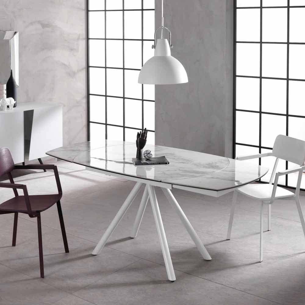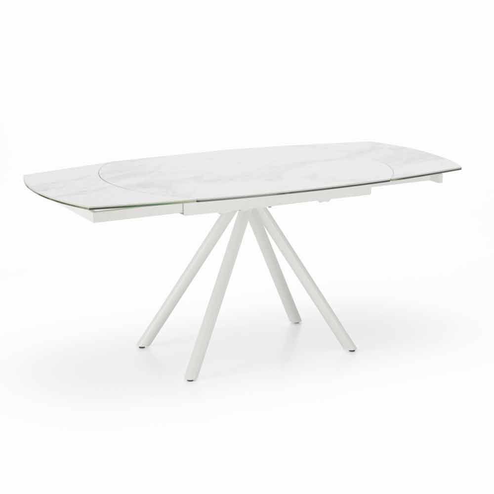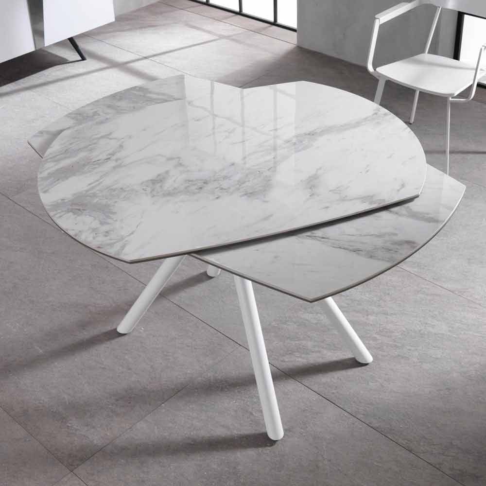 Table extensible moderne avec plateau en céramique effet marbre, Lozzolo Lozzolo est une table extensible avec un design unique et innovant; avec une légère pression, faites simplement tourner le dessus pour allonger la table. Fabriqué avec une structure et des pieds en métal peint blanc et avec un plateau en céramique effet marbre. Grâce à son style et son design, il sera parfait pour meubler vos pièces avec élégance et originalité.