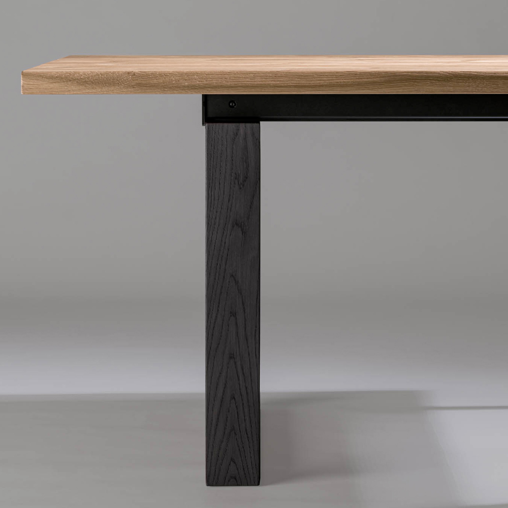 Table à rallonge avec plateau biseauté en placage chêne naturel sur aggloméré de peuplier et chant écorcé. Pieds plaqués et biseautés en bois massif peint en chêne fumé.2 rallonges de 50 cm chacune sont incluses, une sous la table et l'autre externe.