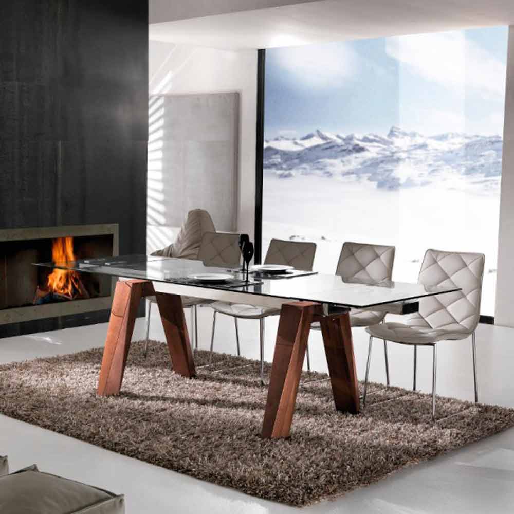 La table extensible Chad a un plateau en verre transparent, qui révèle les jambes en bois massif teinté noyer américain.